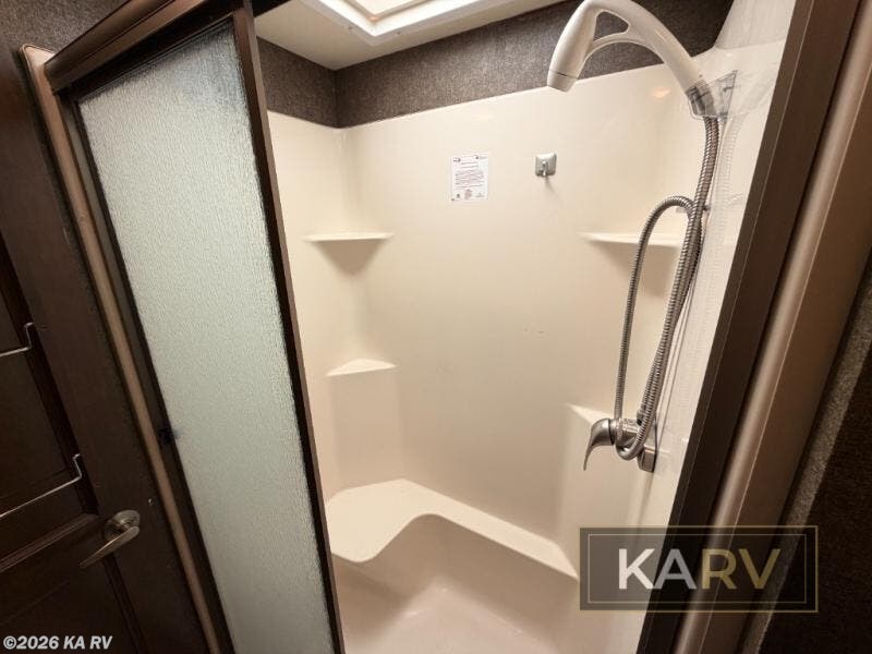The side aisle bathroom has a toilet and a sink along the road side of the motor home. Along the opposite side there is a 32"x40" shower.