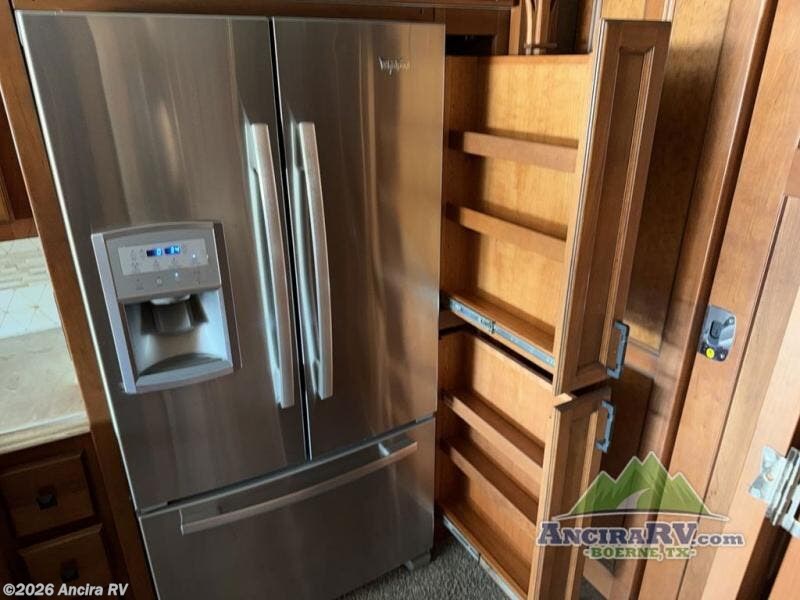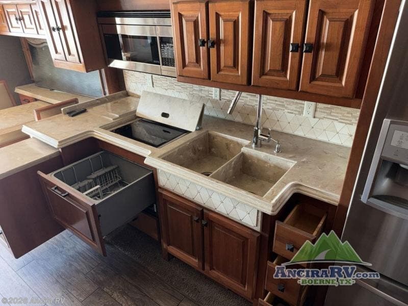 On the inside enjoy dual opposing slide outs in the main kitchen and living space, as well as in the master bedroom and bath area. Just behind the driver and passenger chair you find a dinette with computer work station on the left, plus the kitchen area to follow. Here you will enjoy counter space, a stove-top and range with overhead microwave oven, plus an optional drawer type dishwasher for added convenience. There is also a double sink, a residential refrigerator, pantry, plus ample overhead storage for dishes.