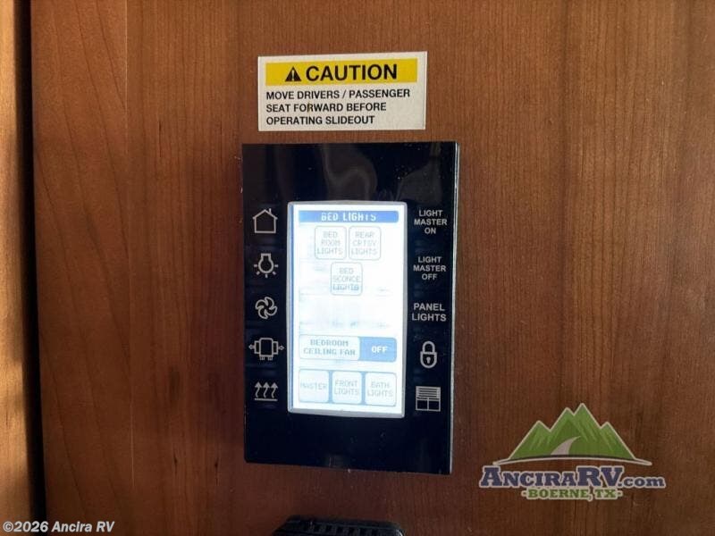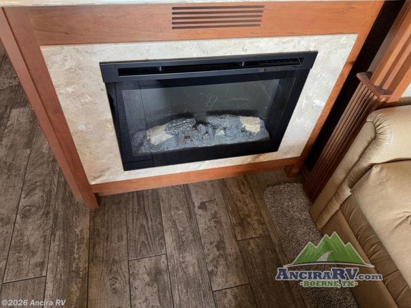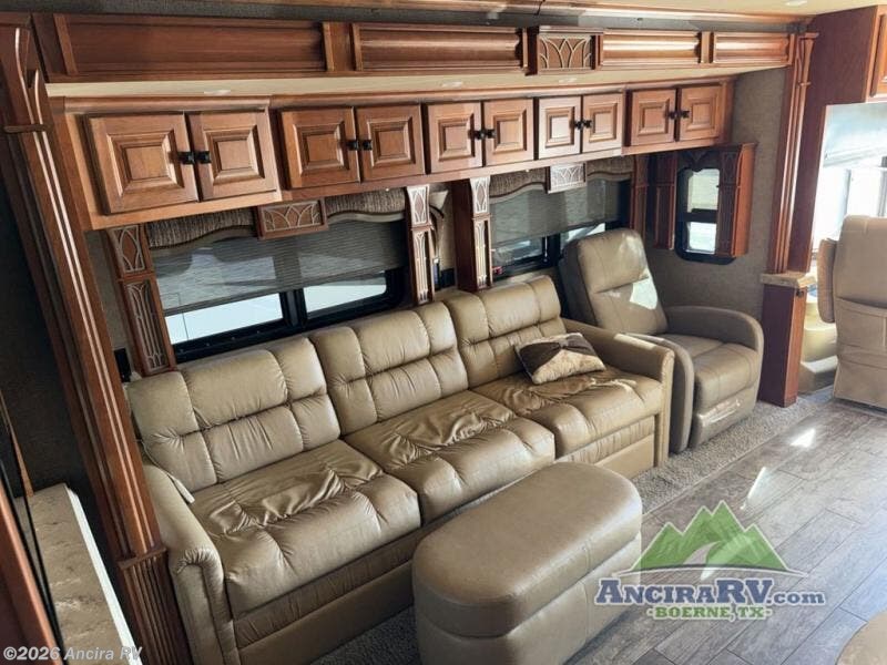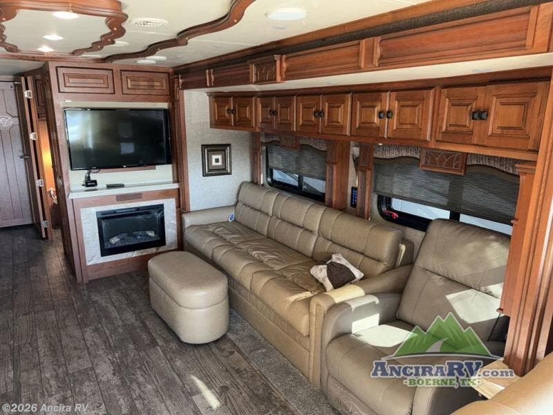Along the road side there is a slide out sofa bed with ottoman, plus a recliner behind the driver's seat. There is also overhead storage to help keep things neat and organized. A TV and fireplace can be found along the interior wall.