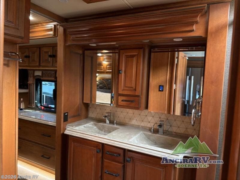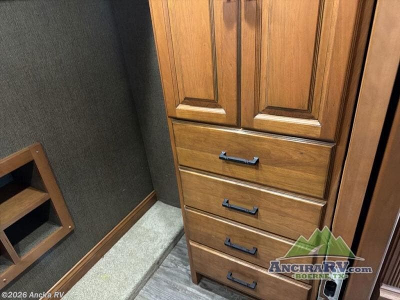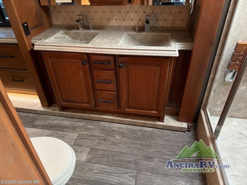The bathroom is centrally located and offers entry from the living area, or from inside the master bedroom. Enjoy a spacious shower, toilet, and a vanity with dual sinks along with overhead cabinets that are part of the bedroom/bath slide out. This slide continues toward the rear of the unit and features storage with drawers, plus more overhead cabinetry, and a bedroom TV too.