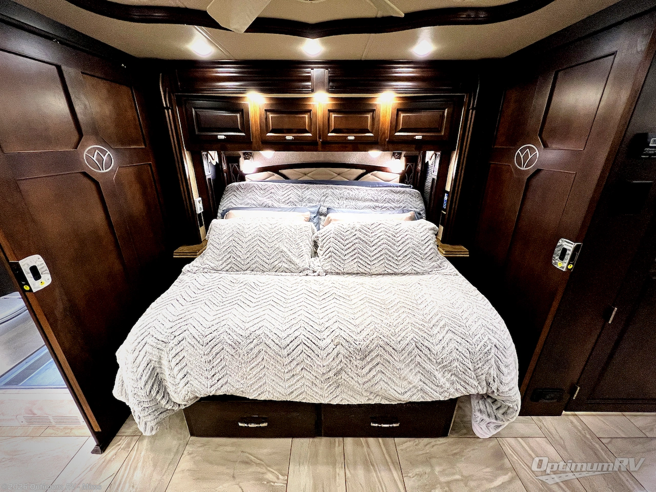 The bedroom has two slide outs. The first slide has a queen bed or you can choose an optional king if you prefer a bit more room while you sleep. On either side of the bed there are nightstands, and above you will find an overhead cabinet. Across from the bed there is a TV, drawers, and in the bathroom there are his and her sinks. Across from the sinks you will find a shower and toilet.
