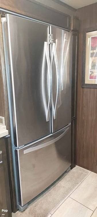 The kitchen is well-equipped with a residential-style two-door refrigerator with a pull-out lower freezer drawer, a 3-burner cooktop, and a double-basin sink.