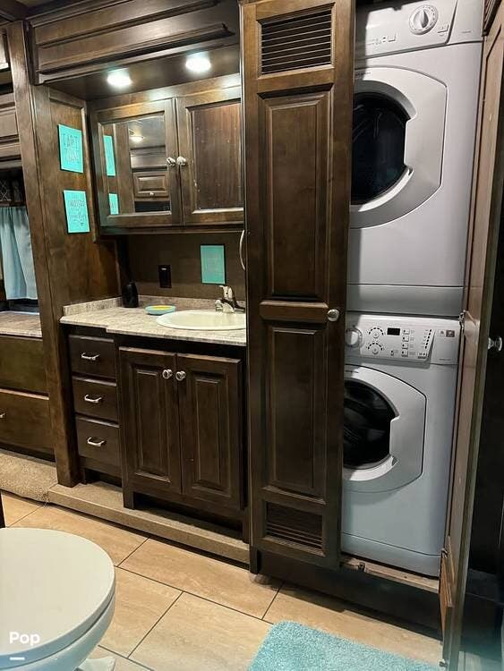 This 34PA has the optional stacked washer & dryer, residential refrigerator, two 13,500 BTU air conditioners, and the higher 7' interior ceiling height.