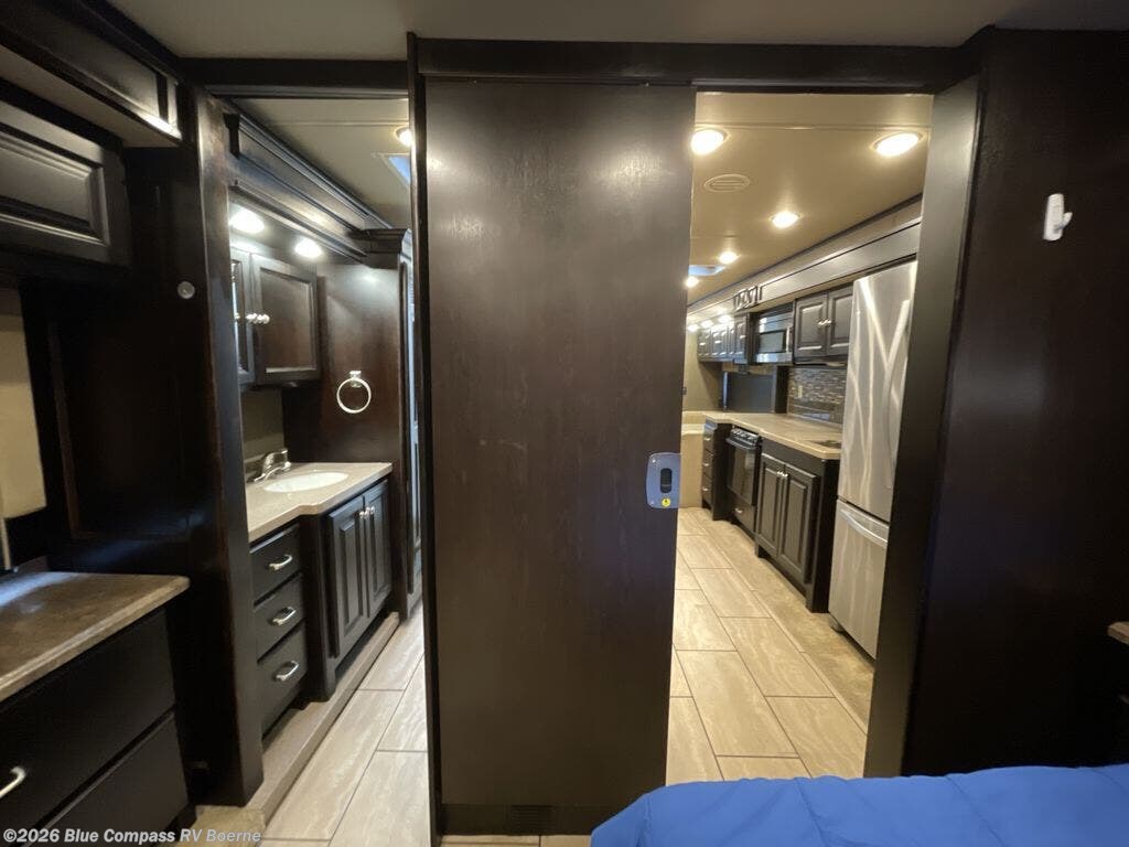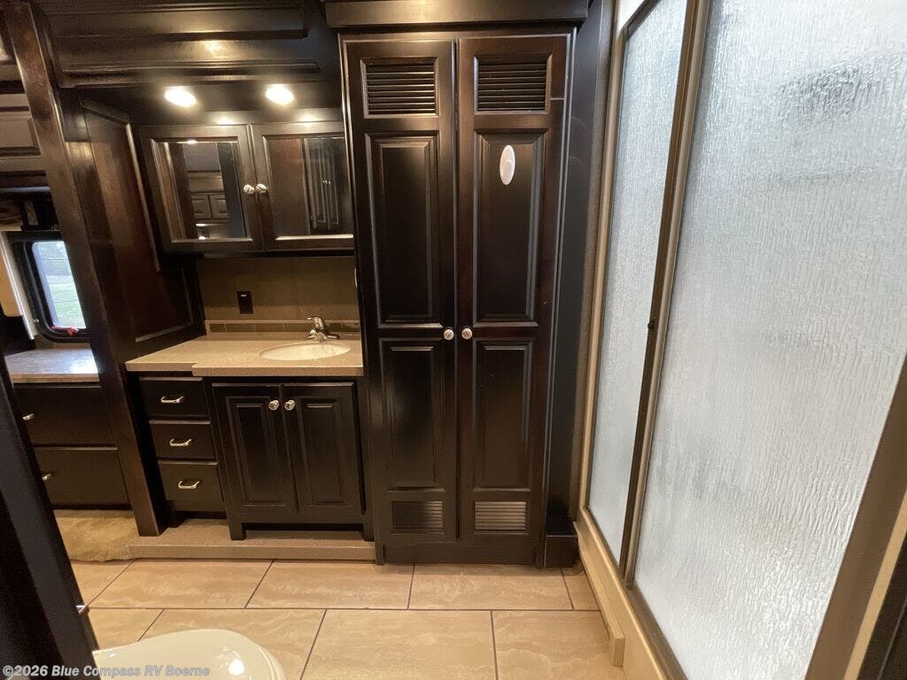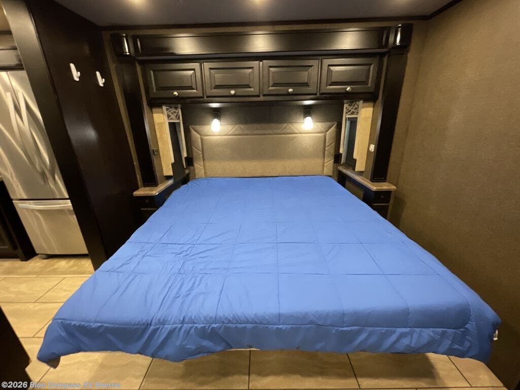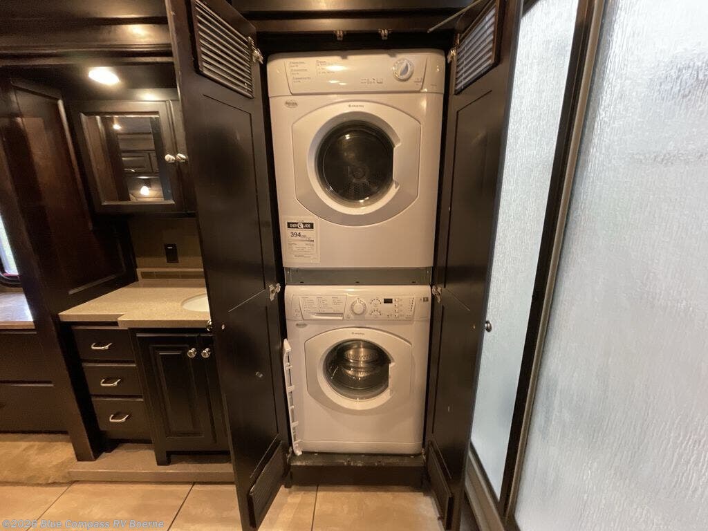 Enter into the rear bedroom and find a slide out with a queen bed or optional king, nightstands, and an overhead cabinet along one side. Along the rear wall of the room there is a TV for your enjoyment. Across from the bed there is a slide out with a wardrobe, overhead cabinet with drawers below, and continuing into the bathroom the slide has a sink, and an optional washer/dryer. The bathroom also has a shower, linen cabinet, and toilet. You will find easy access into the bathroom from either the hallway or from the bedroom.