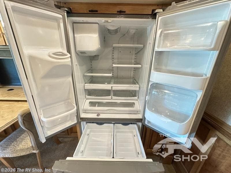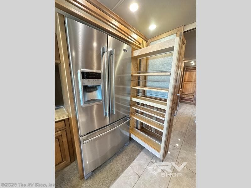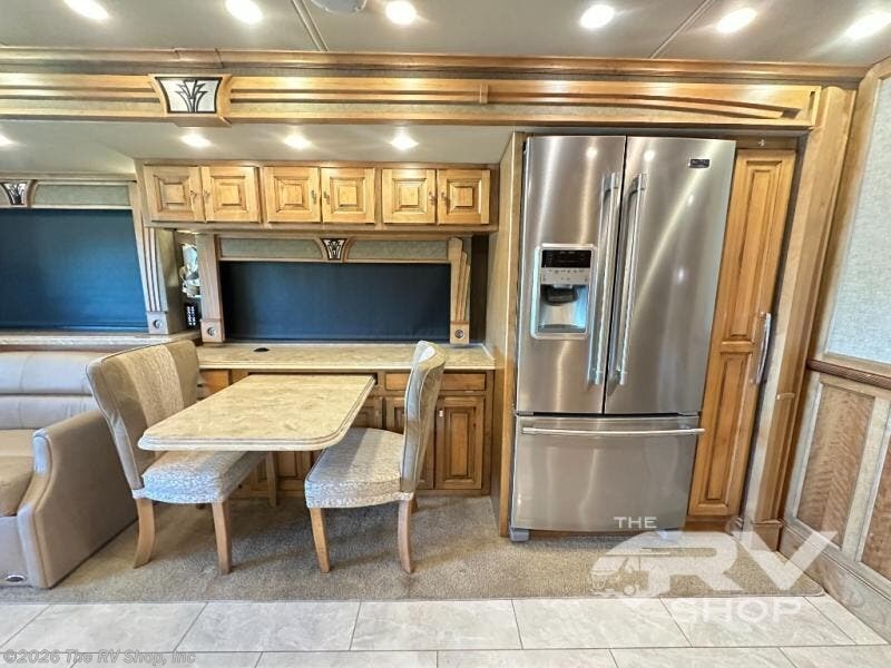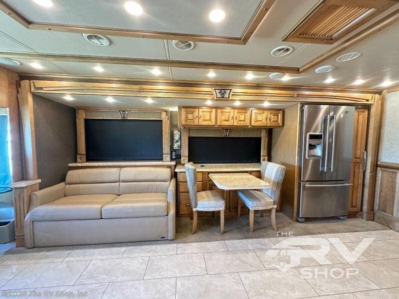 Enter the side door and find a slide out to your immediate left. The slide starts with a sofa including an overhead cabinet and lift TV, plus booth dinette for seating. This too has cabinetry above for your things. The slide continues a bit further along the curb side including a residential refrigerator and a pantry.