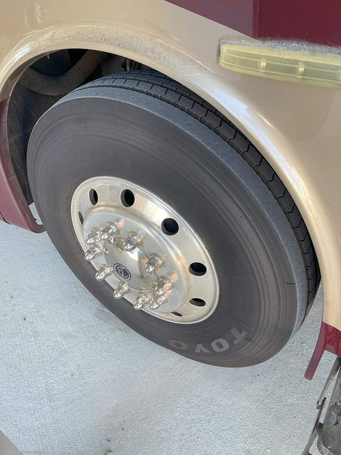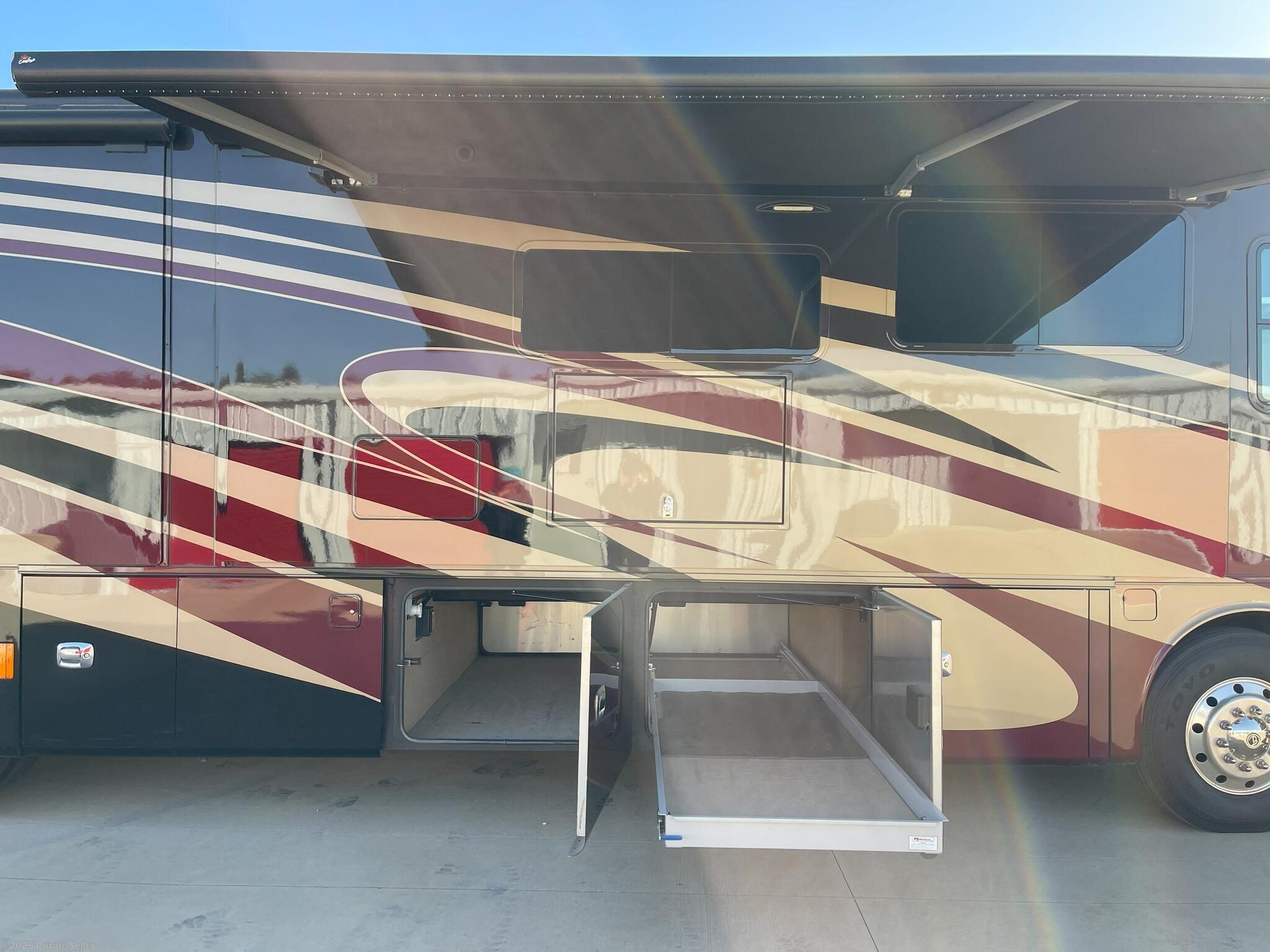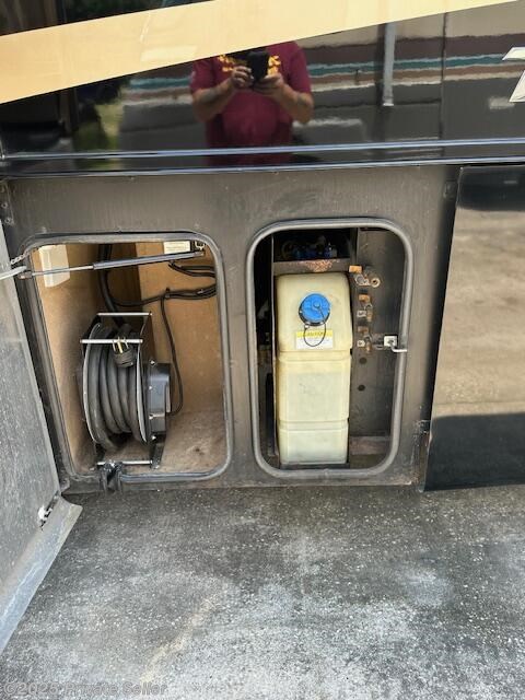 Other features including a push-button “Carefree” folding awning and door and window awnings, automatic coach leveling system, keyless entry main door, InterVac central vacuum system, electric power cord and water hose reels. There is a wall safe mounted in closet wall, pull-out pantry cabinet, solar and black-out window shades (main windshield shades are push-button operated)