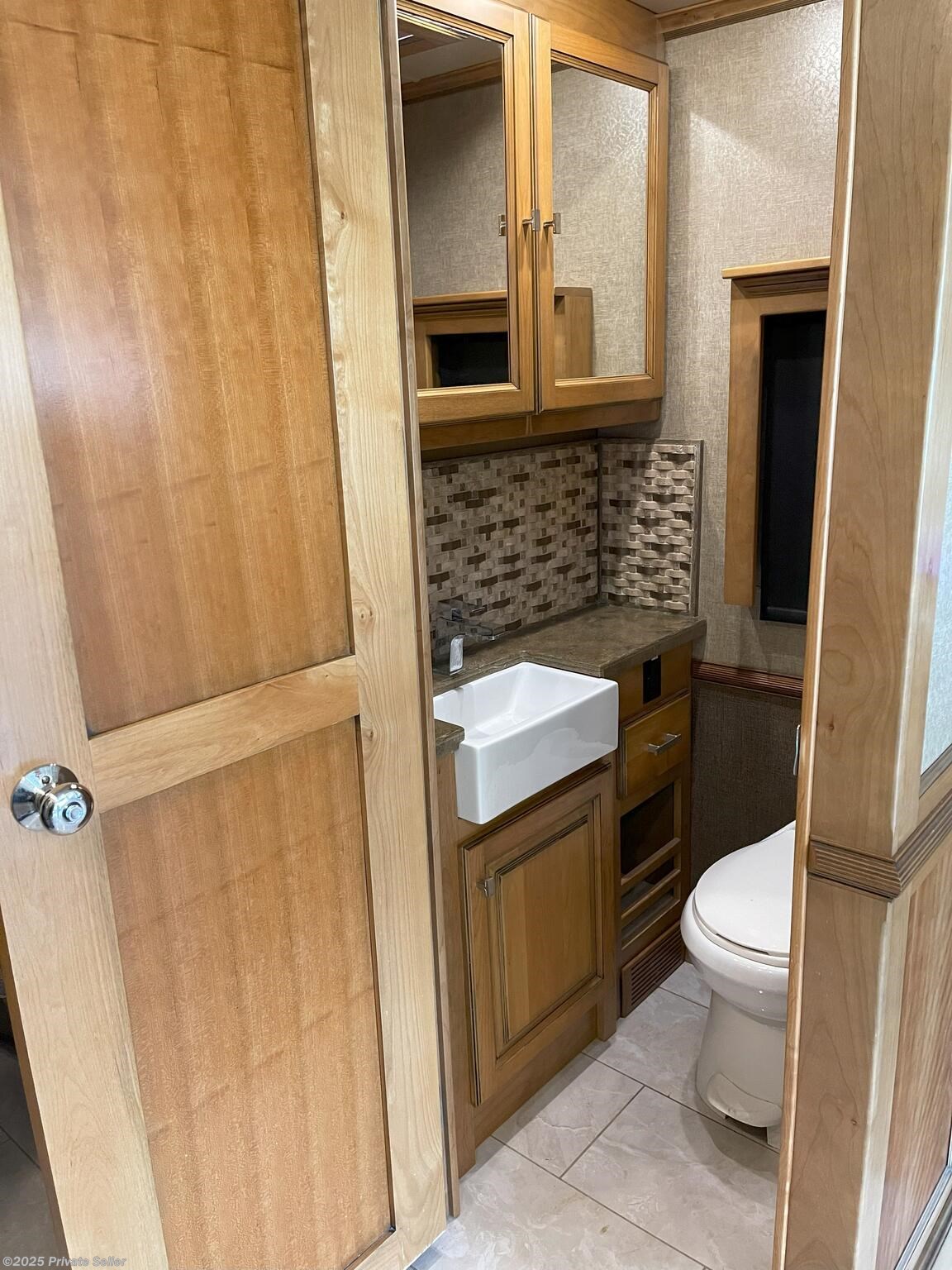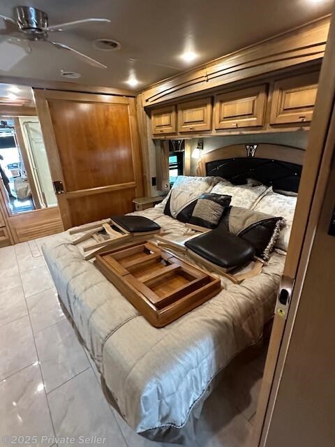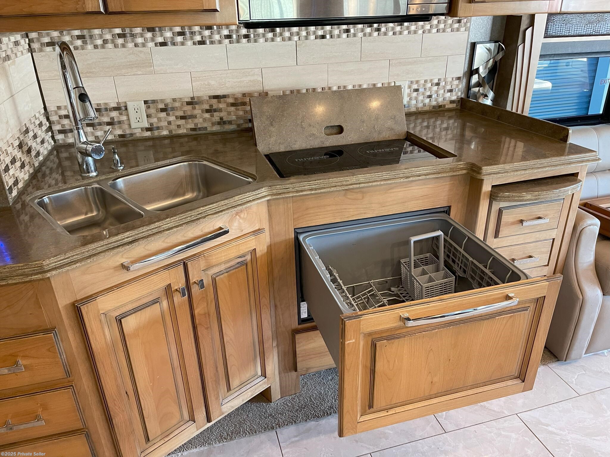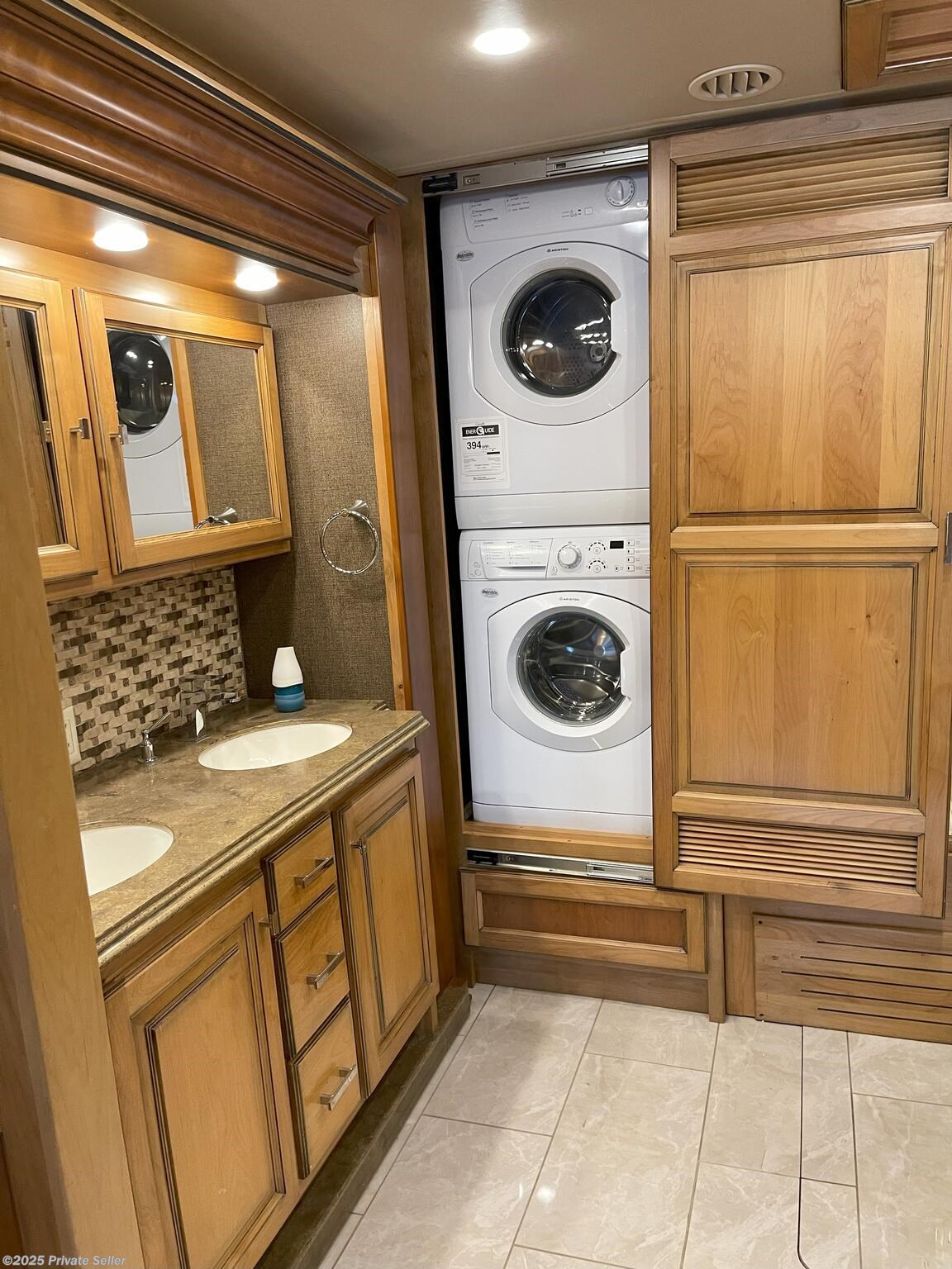 Other features including a push-button “Carefree” folding awning and door and window awnings, automatic coach leveling system, keyless entry main door, InterVac central vacuum system, electric power cord and water hose reels. There is a wall safe mounted in closet wall, pull-out pantry cabinet, solar and black-out window shades (main windshield shades are push-button operated)