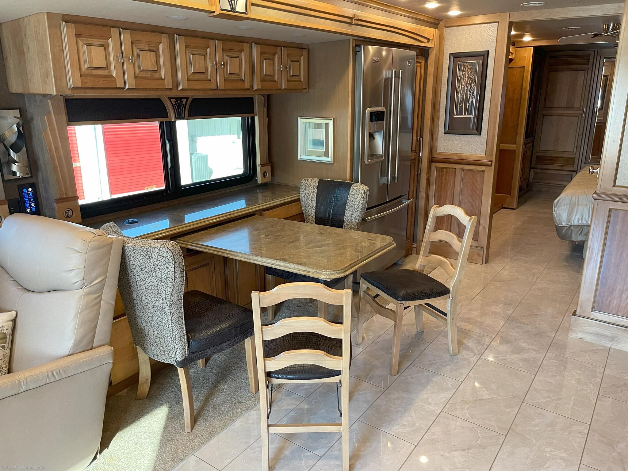 Accommodations include a bedroom with king size, dual remote controlled, Sleepnumber mattress (with storage underneath). Living room sofa converts to a double bed with inflatable mattress and moveable recliner for TV watching. Dining area includes an extendable table with two (2) dining chairs and two (2) folding chairs. A fold-up, custom ordered Tiffin coffee table in matching stain color is included