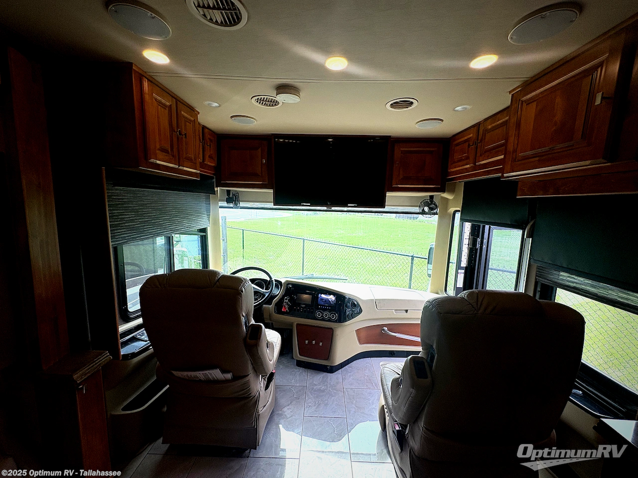 As you enter this class A diesel motorhome at the front curb side, the front of the coach includes lots of overhead cabinets as well as a center mounted TV.
