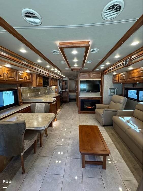 There is a large L-shaped sofa and a matching lounge chair in the living area. You will also find a TV and a fireplace to enjoy. The RV has a total of 4 TVs. (one outside)