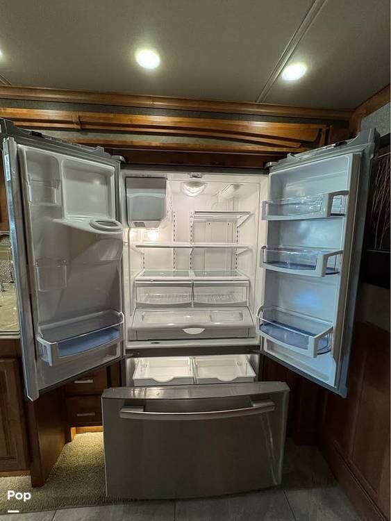 In the galley, there is plenty of space, including a French-door refrigerator with a slide-out drawer freezer. Just like at home, this RV has a table and chair set up for dining.