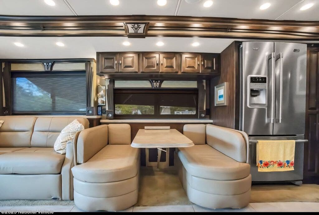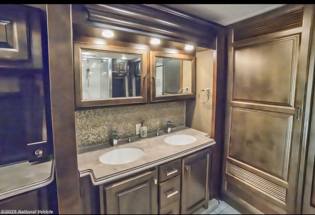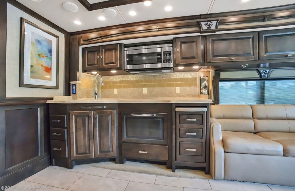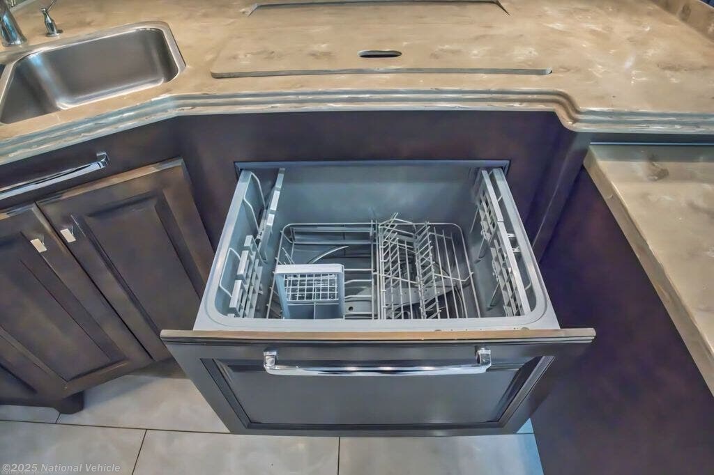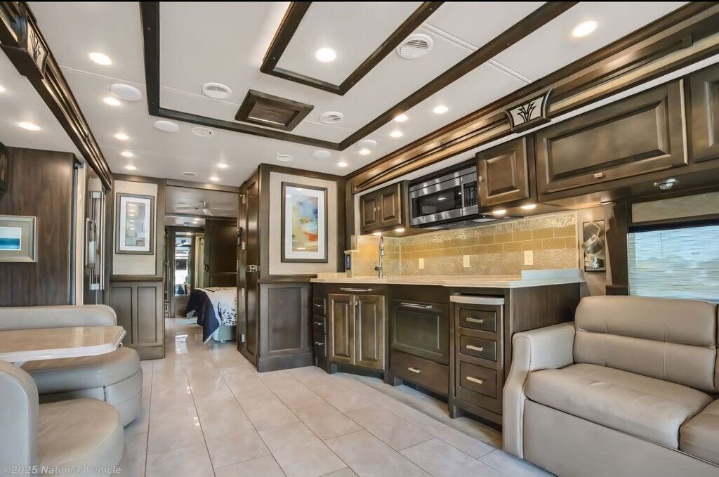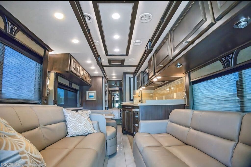 Step inside to discover a beautifully crafted interior featuring quadruple slide-outs that create an expansive living space. The inviting lounge includes ultra-comfortable seating, a sleeper sofa, theater-style recliners, and an entertainment center with fireplace, providing the perfect setting for relaxing or entertaining. The gourmet kitchen is equipped with solid-surface countertops, a residential refrigerator, induction cooktop, convection microwave, dishwasher, and abundant storage, making it a true chef?s delight.