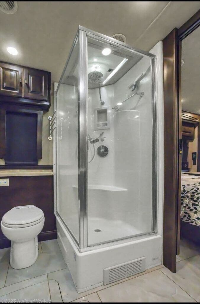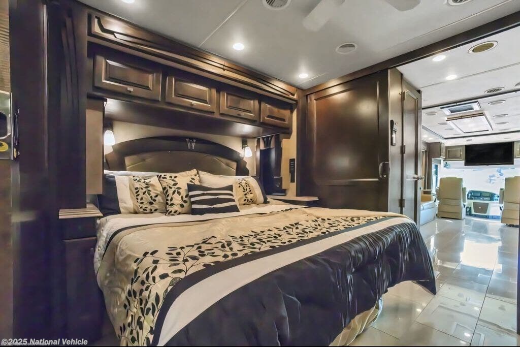 The rear master suite offers a king-size bed, spacious wardrobes, and washer/dryer, while the elegant full bathroom features a large shower with glass doors, dual vanities, and upscale finishes. Additional highlights include high ceilings, polished tile flooring, energy-efficient LED lighting, and abundant basement storage, as well as an exterior entertainment center and power awnings for outdoor enjoyment.