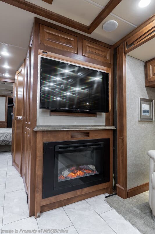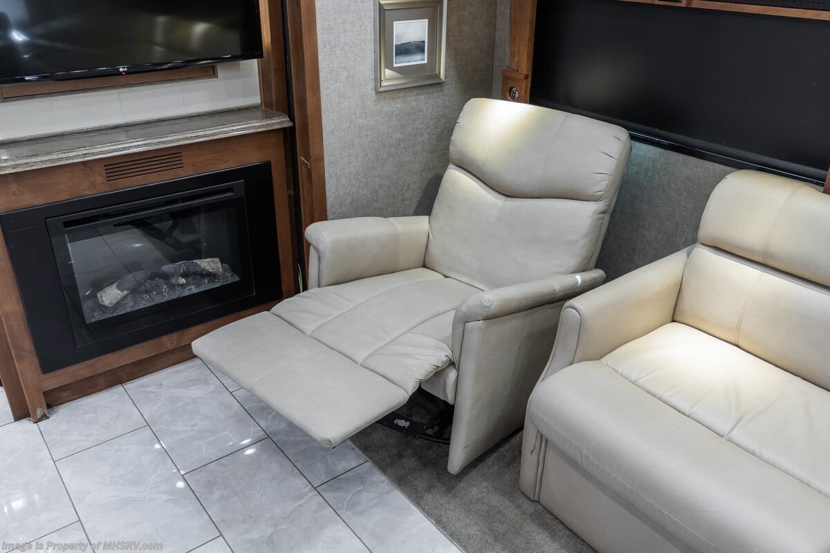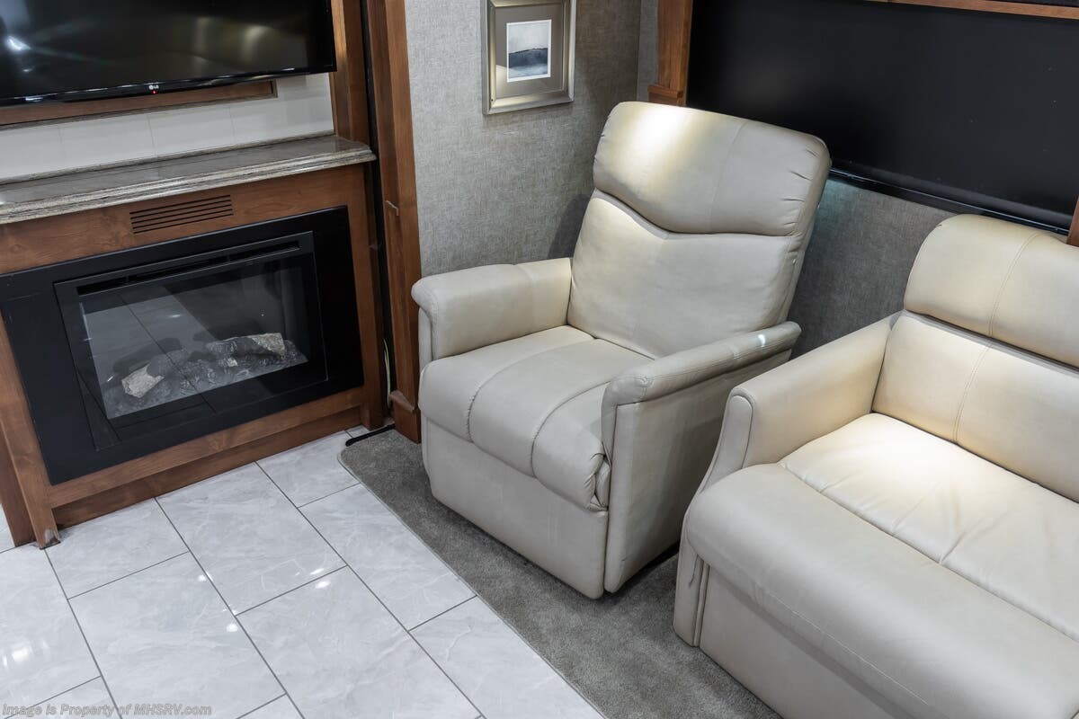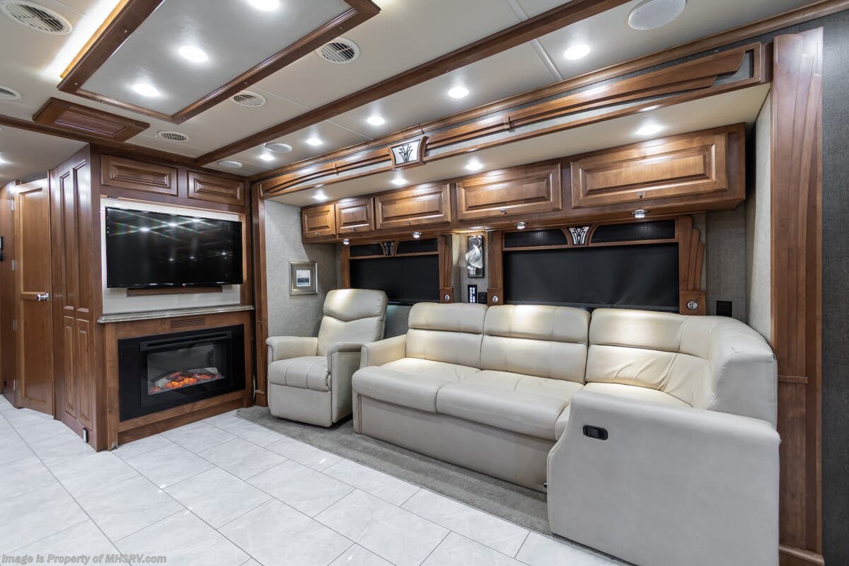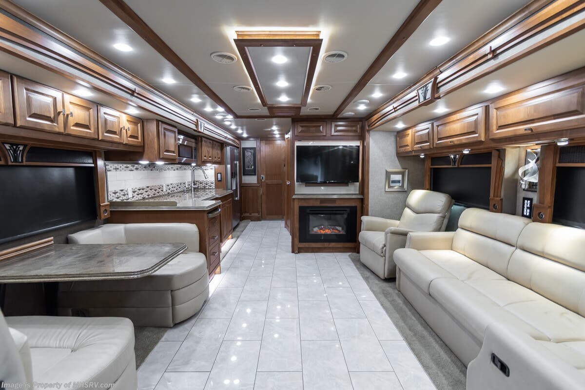 More About This RV This RV features HWH hydraulic leveling, 3 camera system, 3 A/C's, diesel generator, Cummins diesel engine, Freightliner chassis, Tilt/telescoping steering wheel, smart wheel, secondary exhaust brake, GPS, keyless entry, water manifold, patio awning, door awning, window awning, pass through storage, LED running lights, docking lights, black tank flush, water filtration system, power water hose reel, power electrical reel, exterior shower, exterior shower, exterior TV, clear paint mask, ladder, inverter, air ride, ceramic tile, leather seating, stackable washer/dryer, central vacuum, 7 foot ceiling, dual pane windows, fireplace, multi-plex control panel, hardwood cabinets, residential refrigerator with ice maker and much more