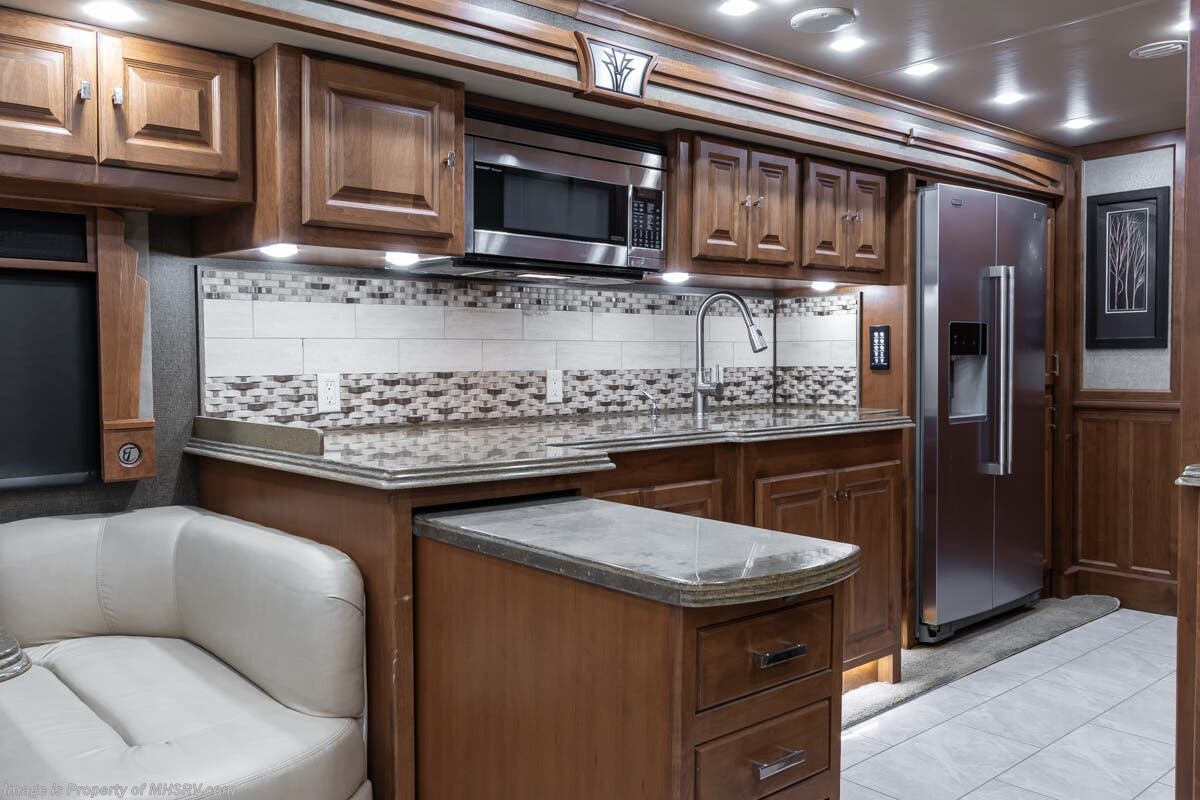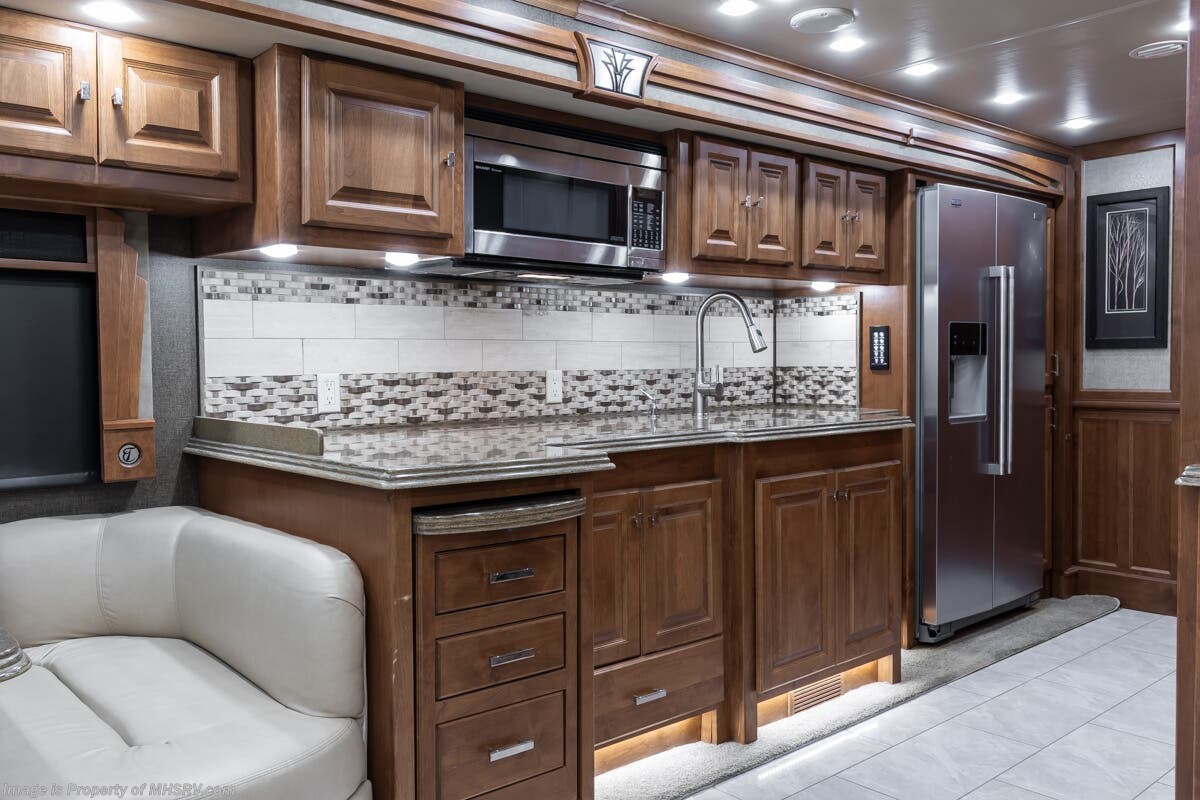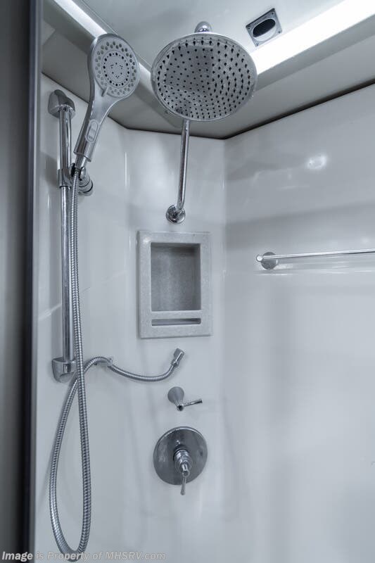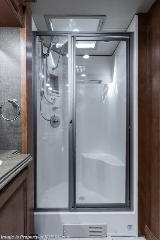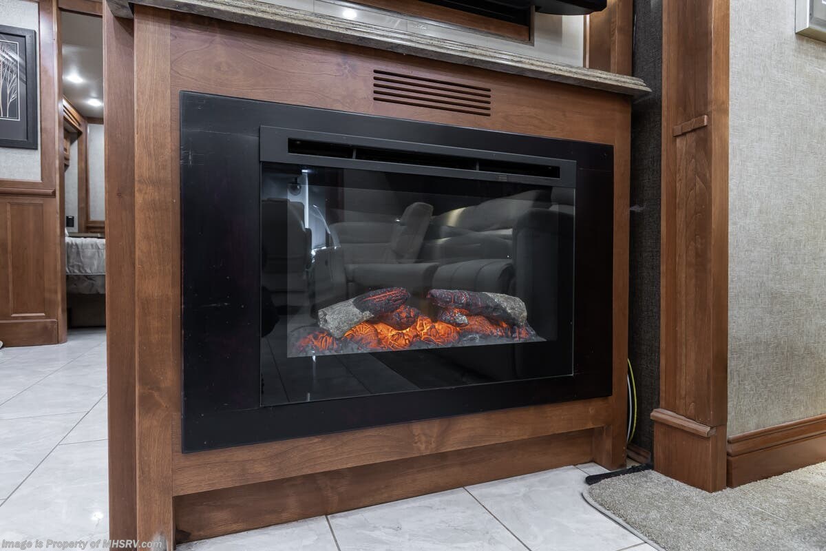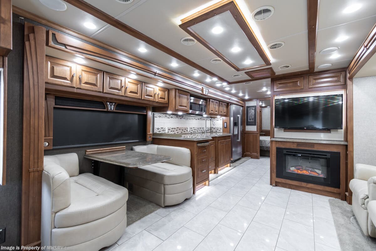 More About This RV This RV features HWH hydraulic leveling, 3 camera system, 3 A/C's, diesel generator, Cummins diesel engine, Freightliner chassis, Tilt/telescoping steering wheel, smart wheel, secondary exhaust brake, GPS, keyless entry, water manifold, patio awning, door awning, window awning, pass through storage, LED running lights, docking lights, black tank flush, water filtration system, power water hose reel, power electrical reel, exterior shower, exterior shower, exterior TV, clear paint mask, ladder, inverter, air ride, ceramic tile, leather seating, stackable washer/dryer, central vacuum, 7 foot ceiling, dual pane windows, fireplace, multi-plex control panel, hardwood cabinets, residential refrigerator with ice maker and much more