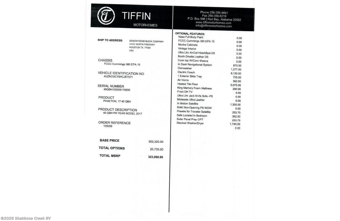 Request More Info on this 2017 Tiffin Phaeton 40QBH * Offered for sale by Shabbona Creek RV
