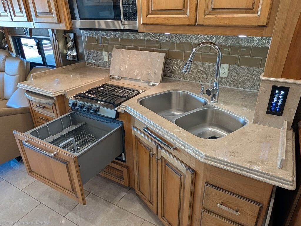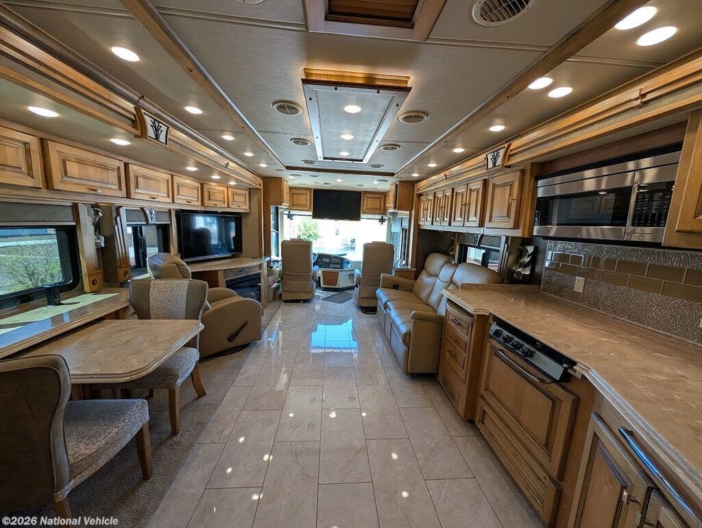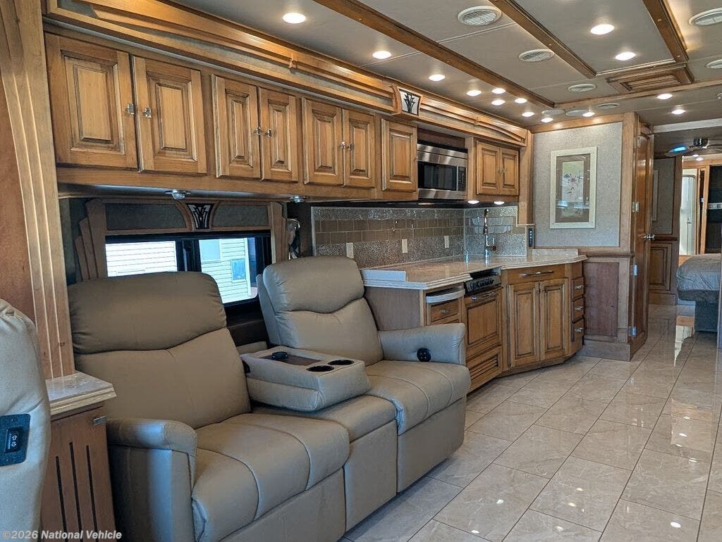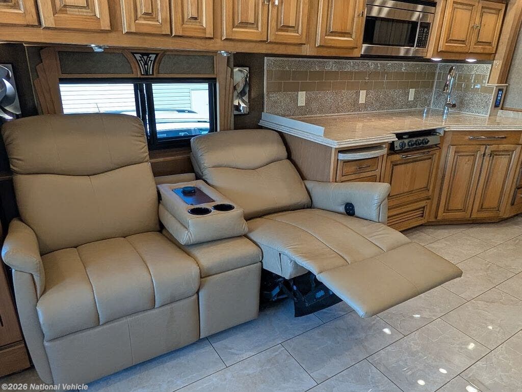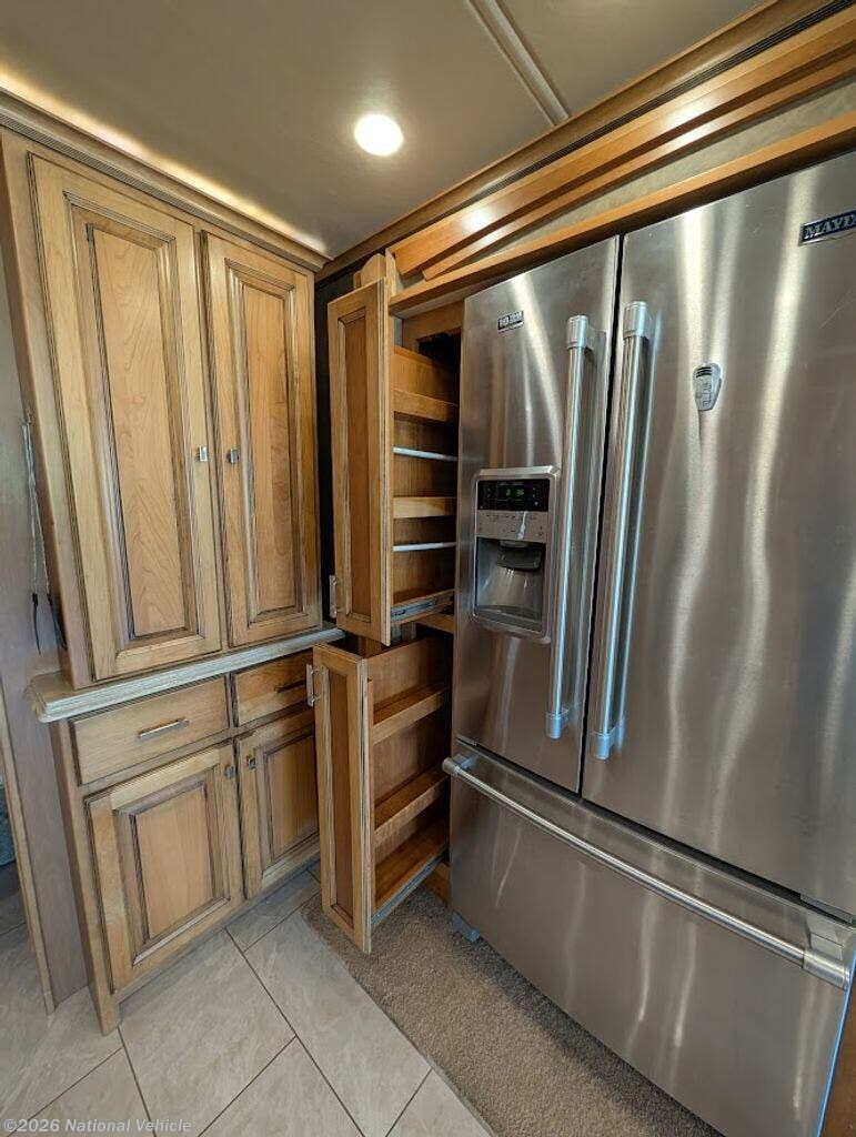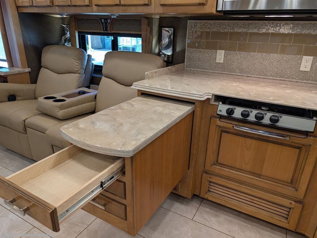 The gourmet kitchen is fully residential in design, offering solid-surface countertops, convection microwave, three-burner cooktop, and a spacious residential refrigerator. Thoughtful storage and high-end fixtures make cooking on the road effortless and refined.