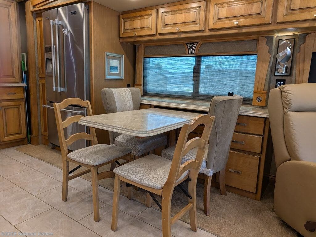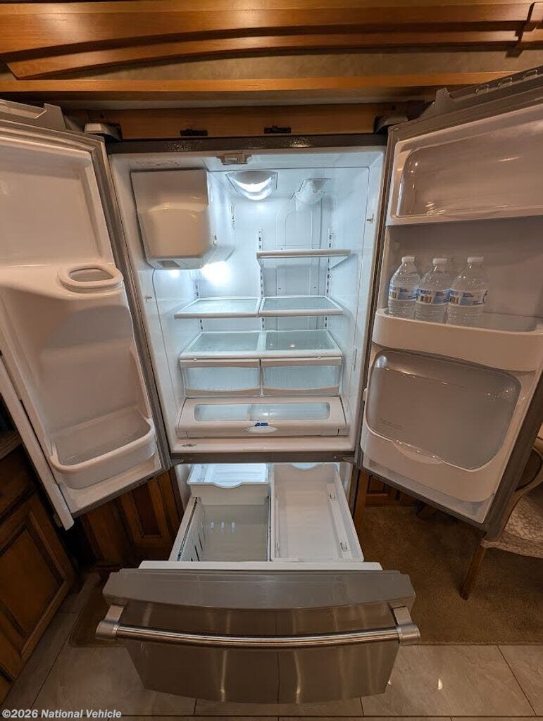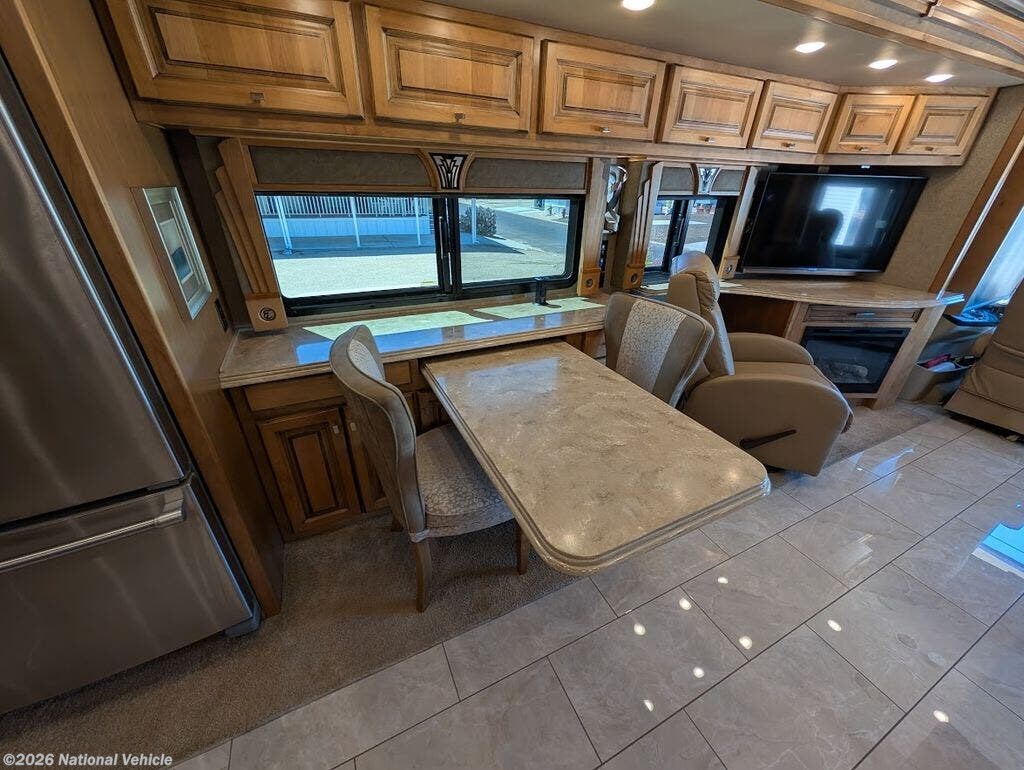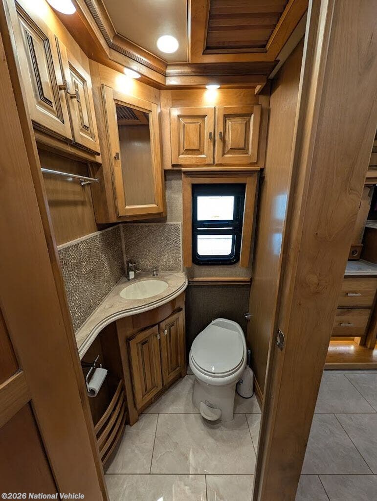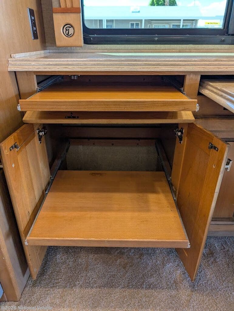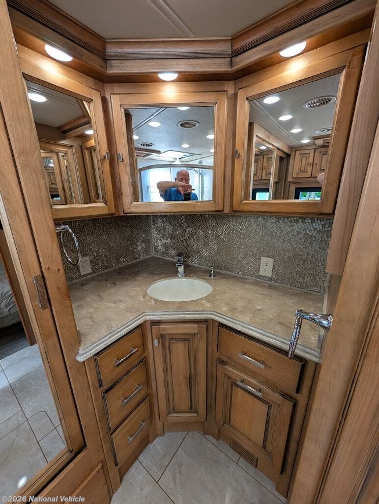 The gourmet kitchen is fully residential in design, offering solid-surface countertops, convection microwave, three-burner cooktop, and a spacious residential refrigerator. Thoughtful storage and high-end fixtures make cooking on the road effortless and refined.