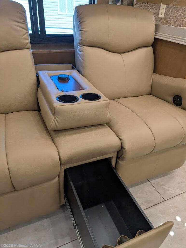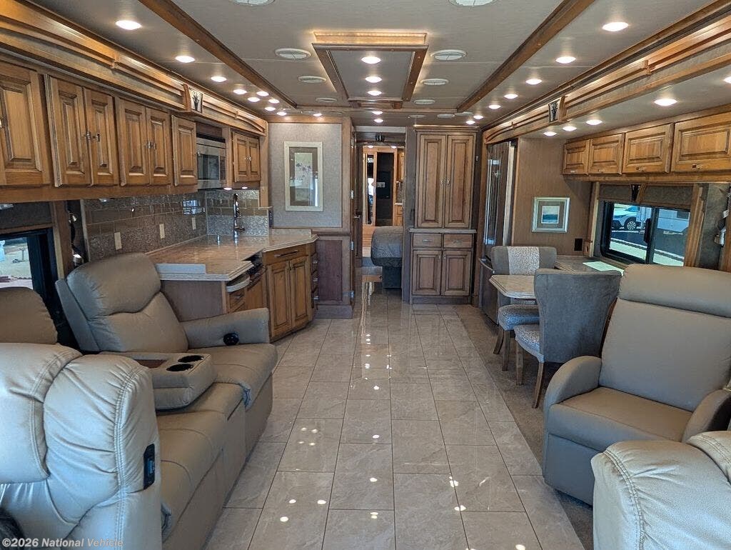 Step inside to a residential-caliber interior showcasing Tiffin?s legendary craftsmanship. Hand-finished hardwood cabinetry, polished tile flooring, rich leather furnishings, and elegant trim create an atmosphere reminiscent of a luxury penthouse on wheels. The spacious quad-slide 40QBH layout opens into a wide, inviting living area designed for extended stays and upscale entertaining.
