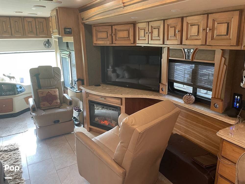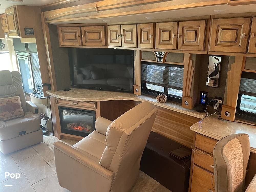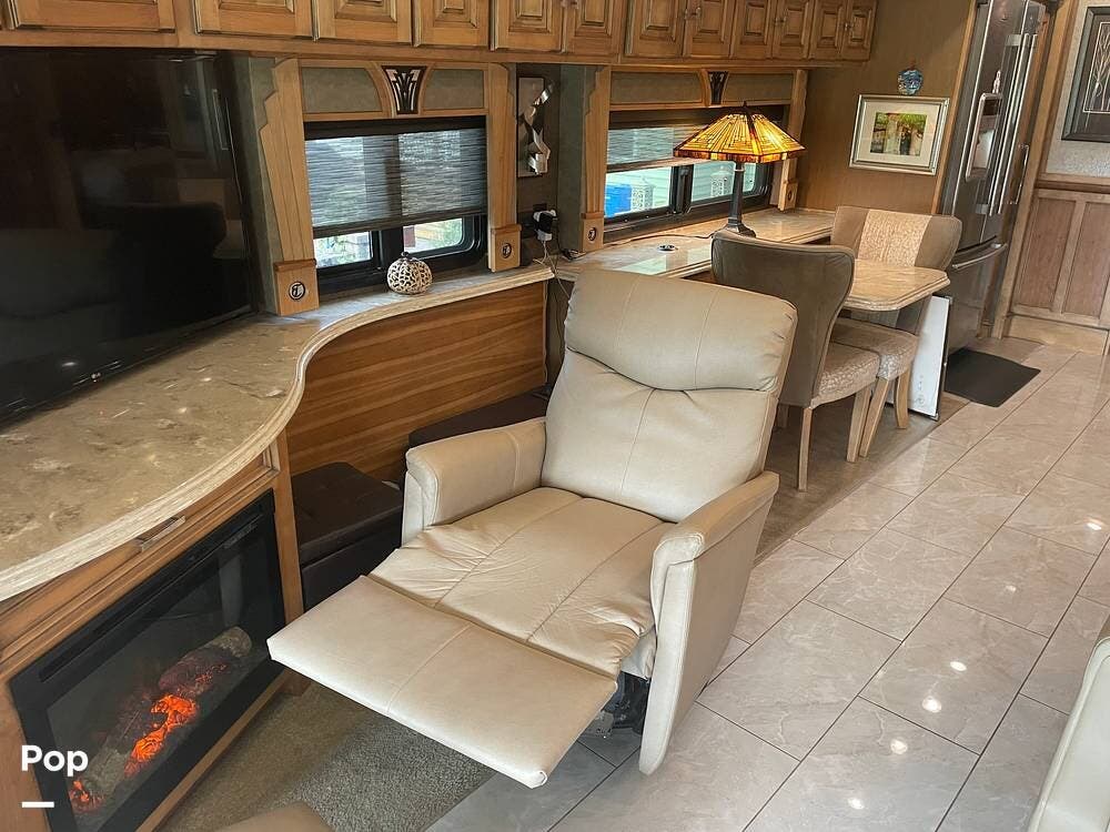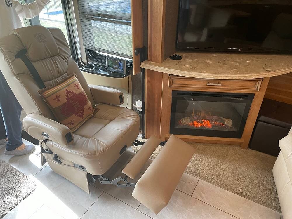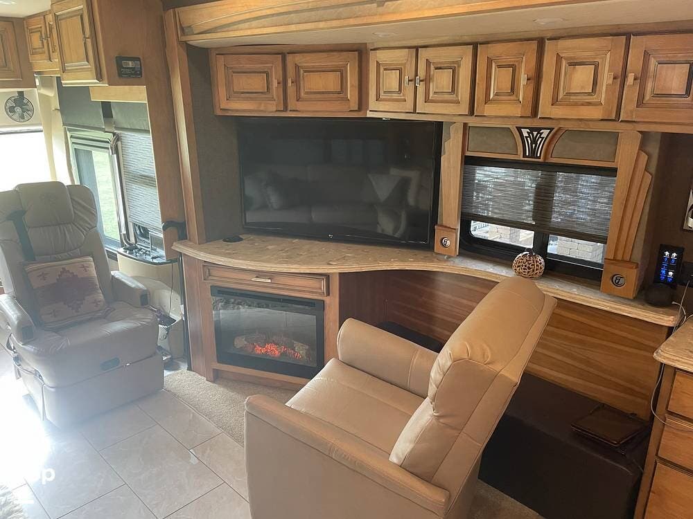 Entering the Tiffin, you'll find a large entertaining area with a wraparound couch, a lazy boy chair, an entertainment center with a TV and a fireplace. Also, the passenger seat swivels to join in the conversation.