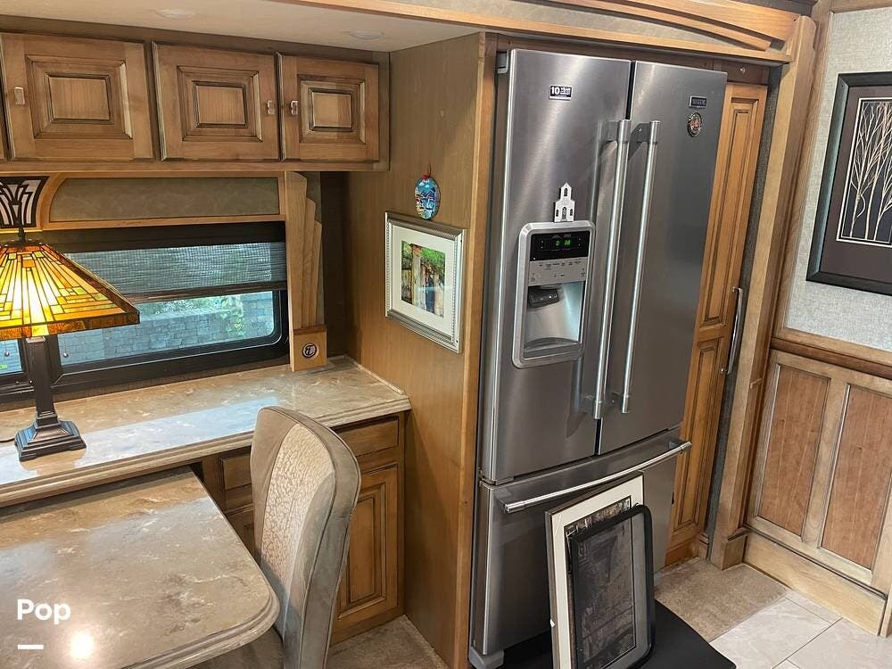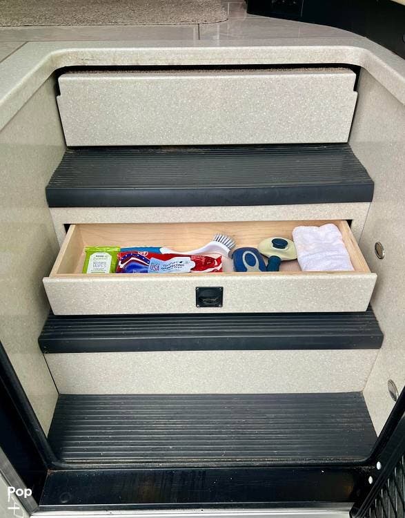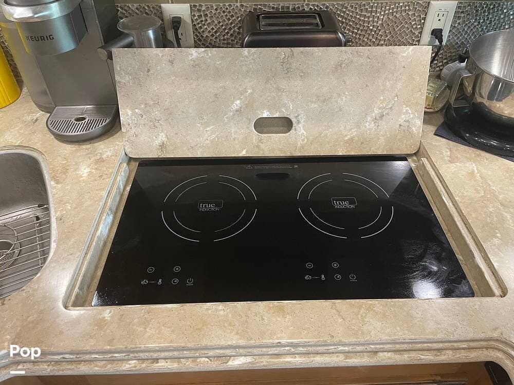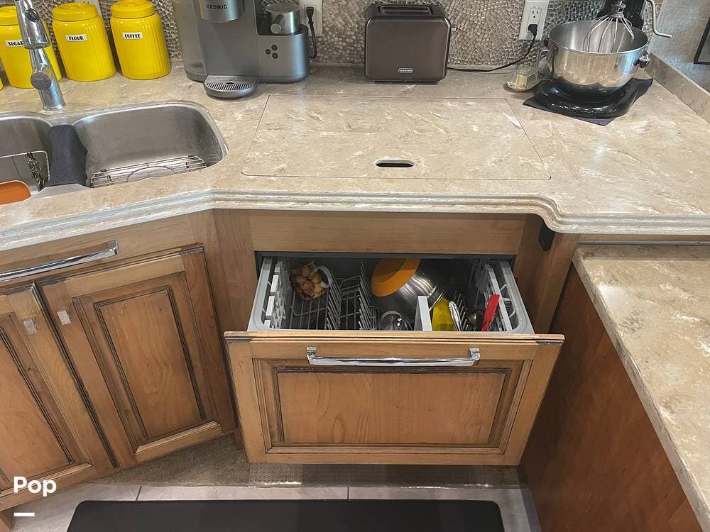 The galley is well equipped with a stovetop, residential-size refrigerator (with water dispenser and icemaker), dishwasher, convection microwave, and dinette with 4 chairs (along with a computer station).