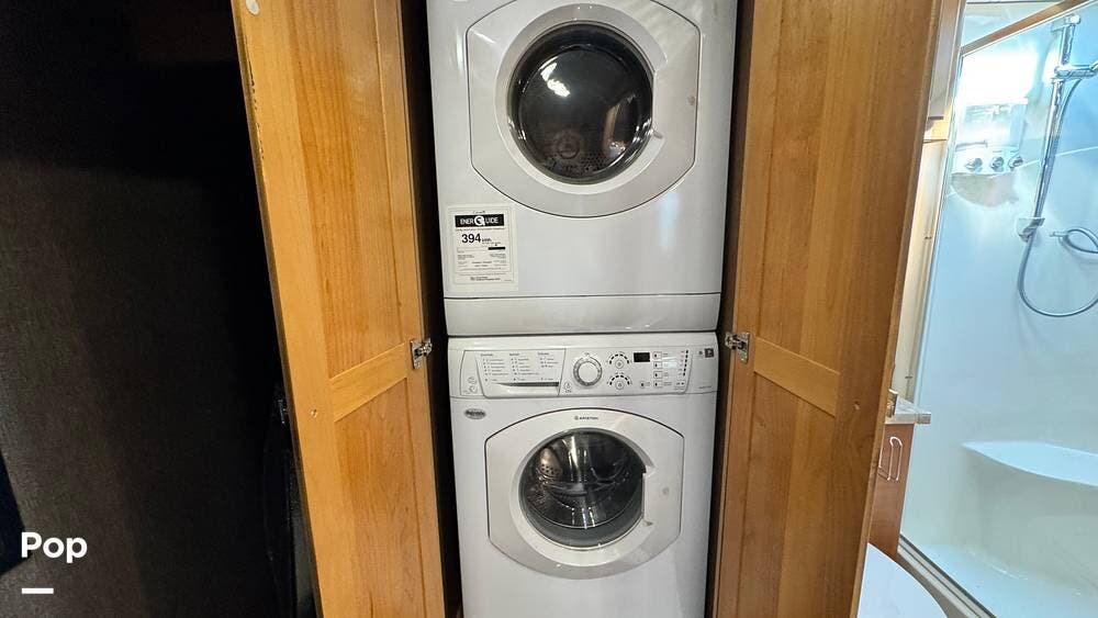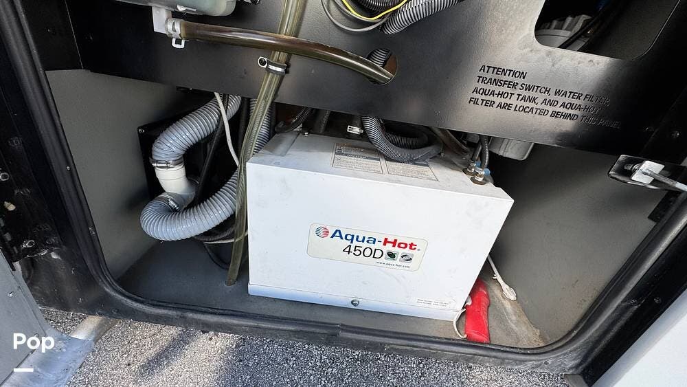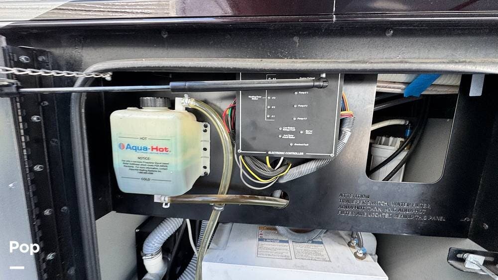 Interior amenities include an AquaHot 450D system, stacked laundry washer/dryer units, one-and-a-half bathrooms with a full bathroom including a shower, a fireplace, a bedroom wardrobe, and three air conditioners with heat pumps.