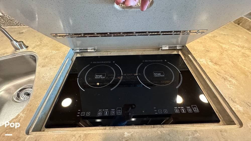 The kitchen features a stainless-steel residential refrigerator/freezer (with icemaker), a covered cooktop range, a convection oven/microwave combo unit, a pantry, and a slide-out table with chairs.
