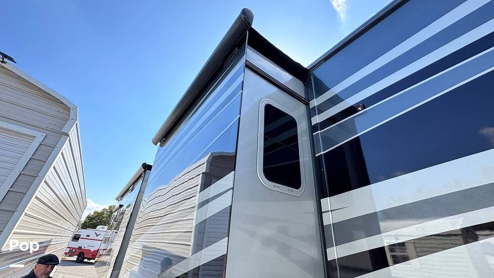 The exterior features four slides, dual awnings, a battery system, a rooftop solar system & digital antenna, and both an easy-slide tray and standard compartmental storage.