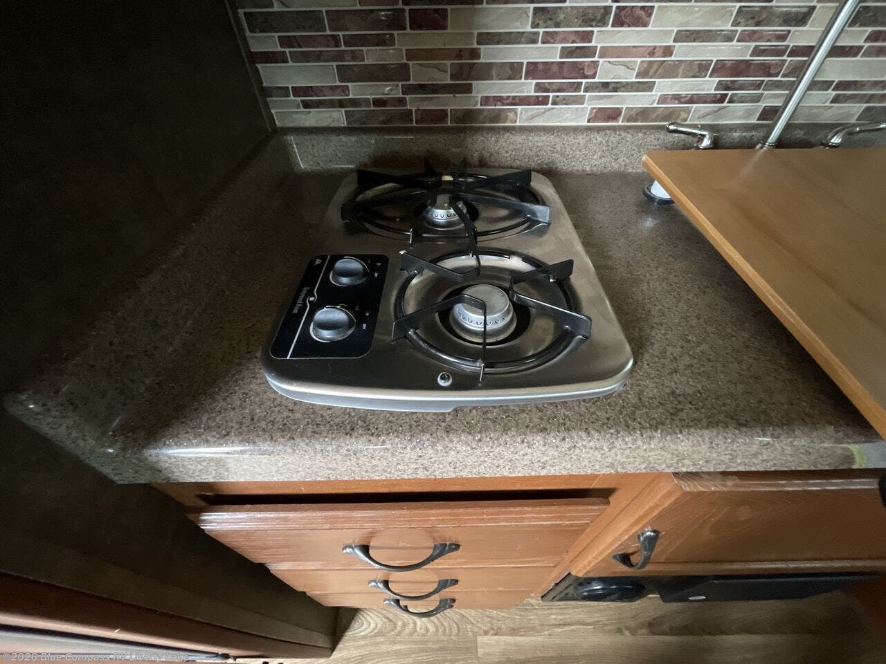 On the opposite side you will find cooking accommodations including a single sink, a two burner stove-top, and overhead range hood. There is a 6 cu. ft. refrigerator for all of your perishable items, and plenty of overhead cabinets for daily dishes, plus lower cupboards and drawer space for things like silverware and your pots and pans.