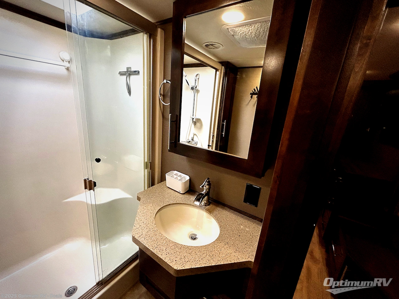 Step inside and notice how open and spacious the main kitchen and living area is with dual opposing slide outs. There is a dining table with four chairs and a theater seating for two in the slide to your immediate left. Along the rear wall you will find more seating with a rear sofa bed including nightstands on either side. Adjacent to the sofa find a 50" LED TV with fireplace within the road side slide out.