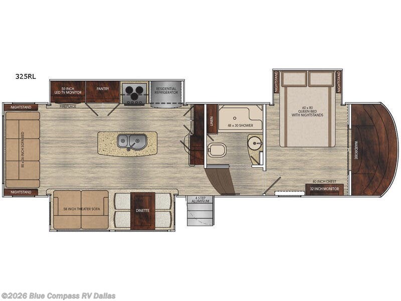 Step inside and notice how open and spacious the main kitchen and living area is with dual opposing slide outs. There is a dining table with four chairs and a theater seating for two in the slide to your immediate left. Along the rear wall you will find more seating with a rear sofa bed including nightstands on either side. Adjacent to the sofa find a 50" LED TV with fireplace within the road side slide out.