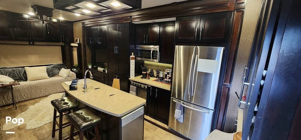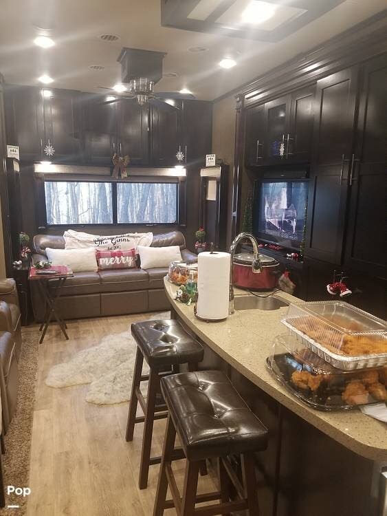 This 2017 Vilano (by Vanleigh RV) 365RL rear living has a mid-door entry leading into the kitchen and dining area with opposing slide-outs, one containing the kitchen, the other containing a recliner sofa.