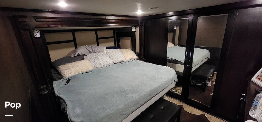 The front bedroom has a slide-out king bed, dresser, and full nose cap wardrobe for storage.