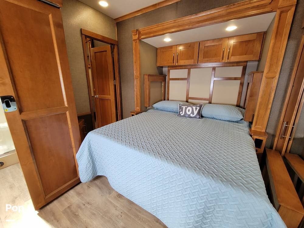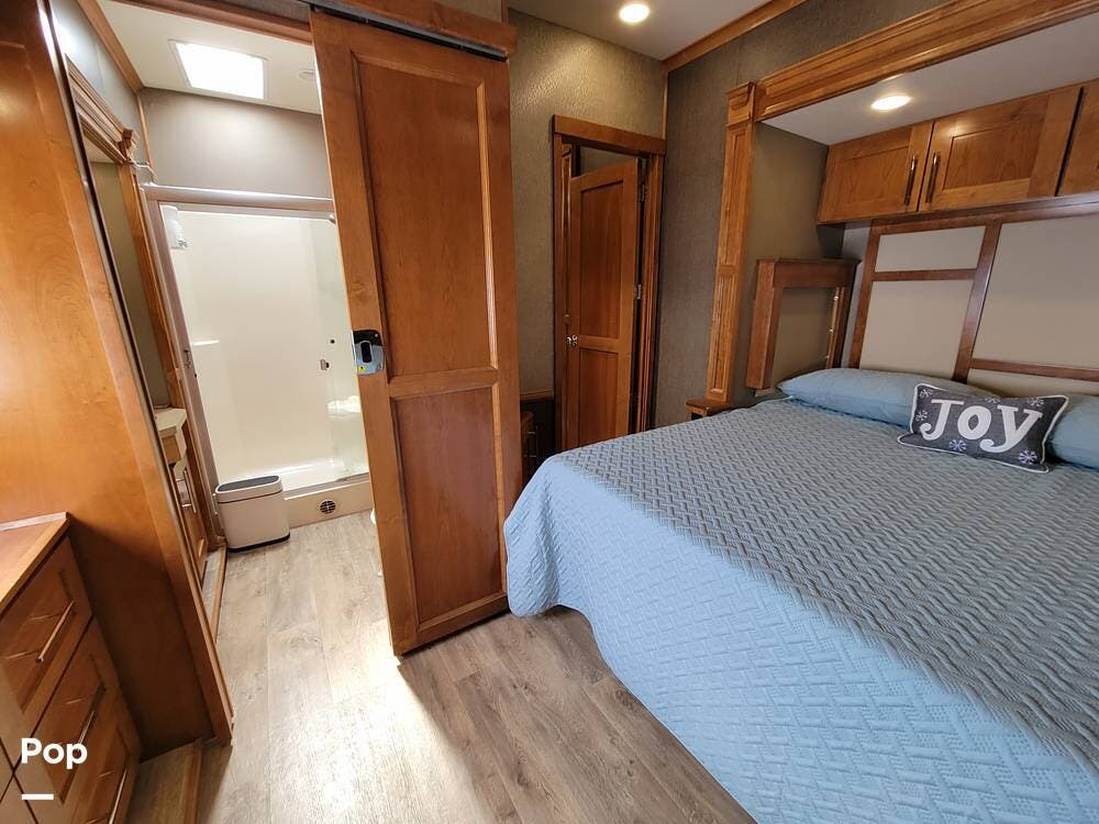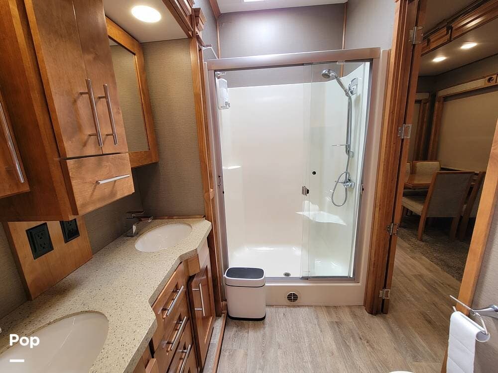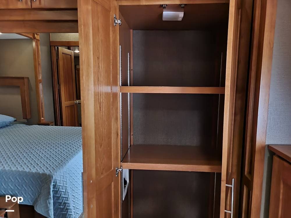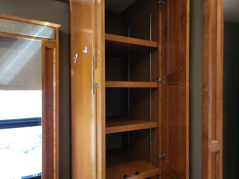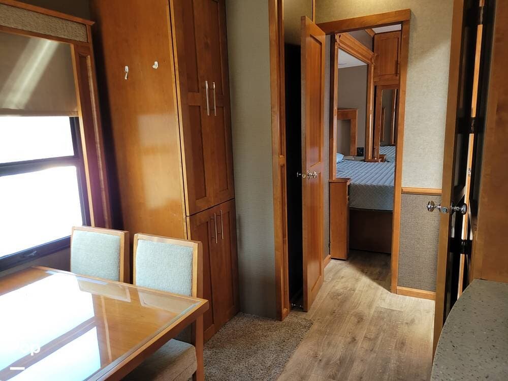The rear of this Vilano fifth wheel features a private master bedroom and complete bath with dual entry doors. The door off the bedroom leads into the bath which features a 48" x 30" shower, a toilet, and a slide out vanity with dual sinks and overhead storage. This slide out continues into the master bedroom where there is also a second bath entry door giving immediate access as well. In the bedroom you find lots of storage, a king size bed and USB ports next to the bed. There is a closet that is prepped for a washer and dryer should you want one.