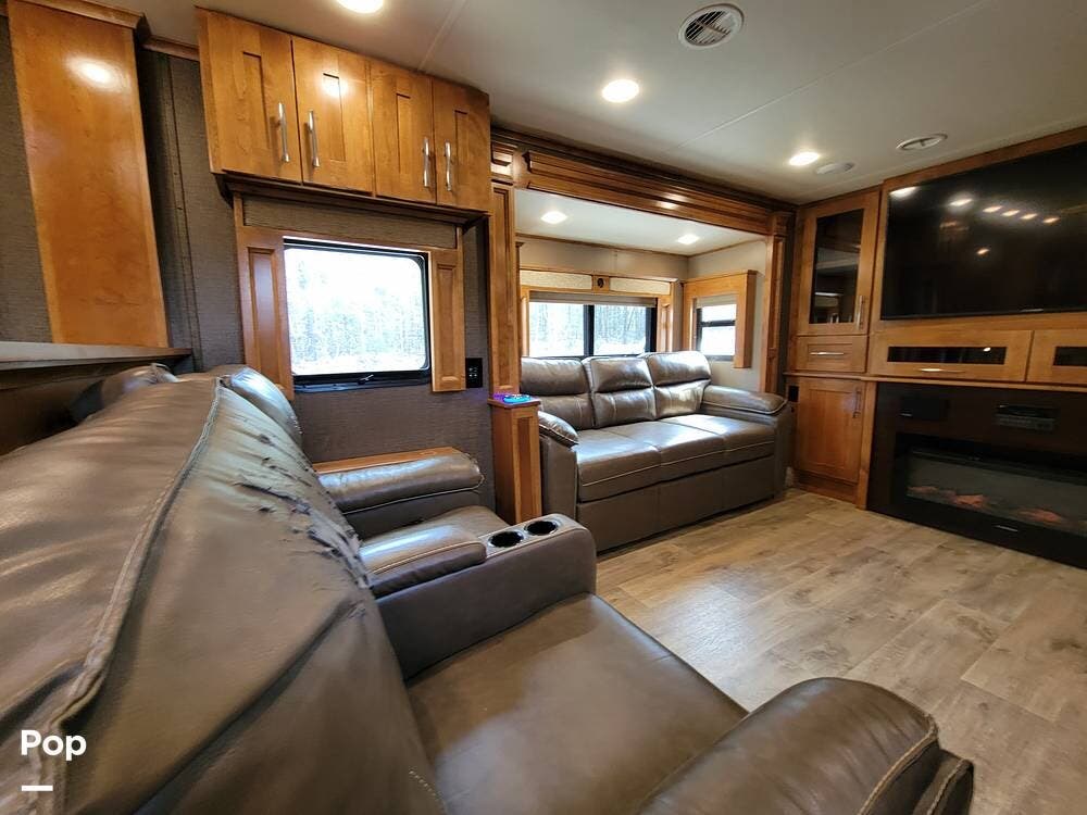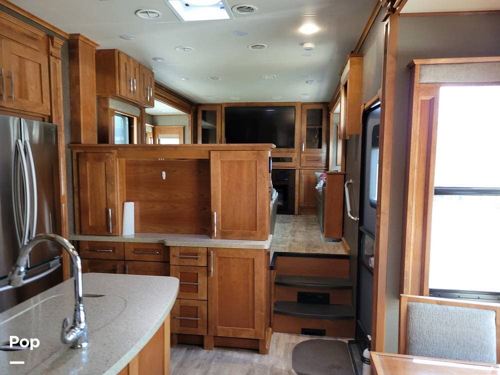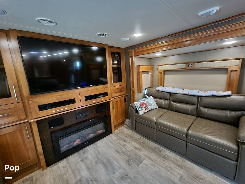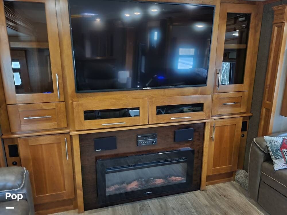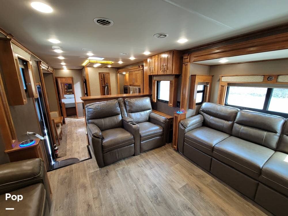 Six slides set the tone for this Vanleigh Vilano luxury fifth wheel! With this much space you will forget that you are not at home! This front living model features a spacious kitchen with residential touches, a complete bath with dual vanity sinks, and a convenient kitchen island, plus fireplace, and more!