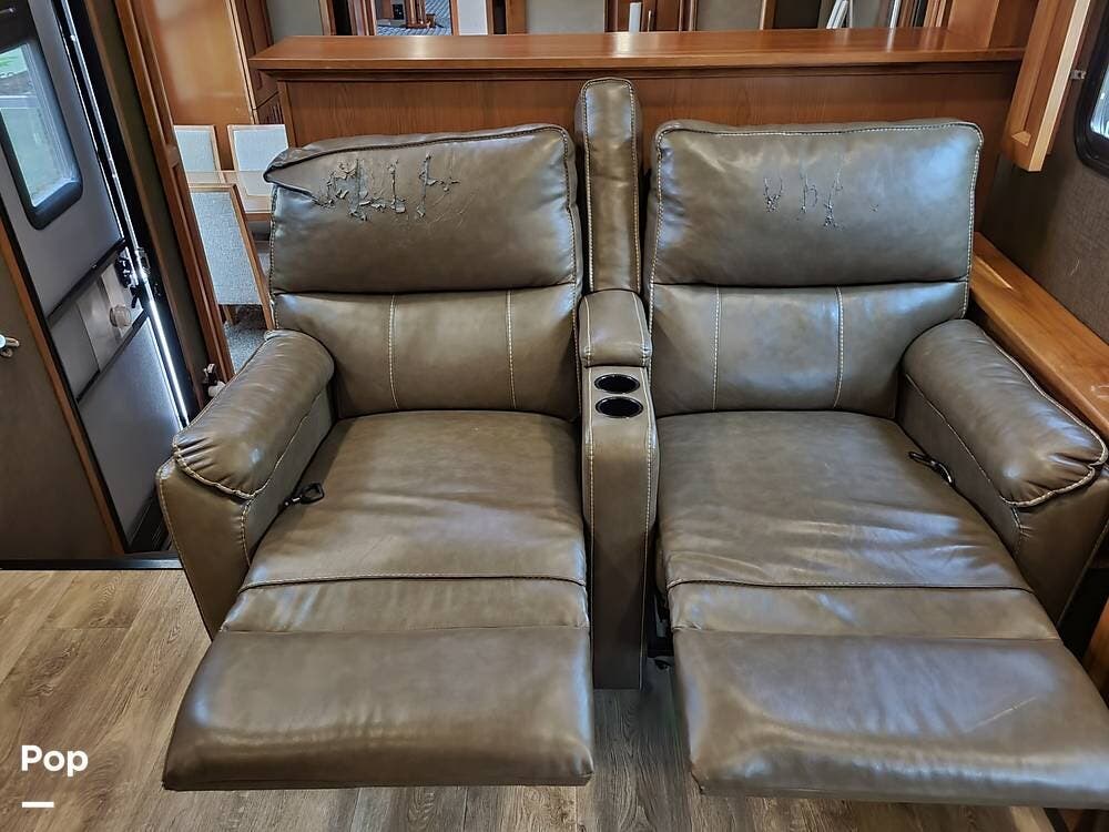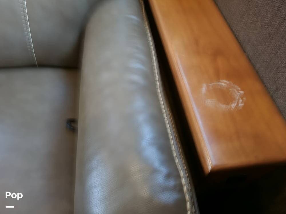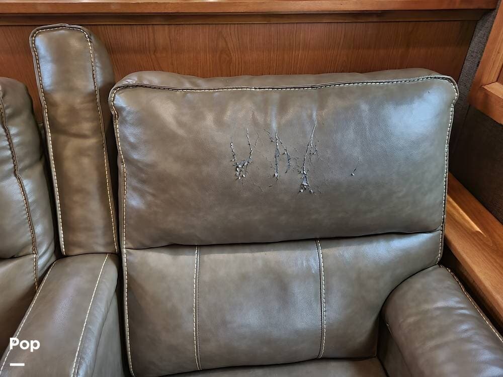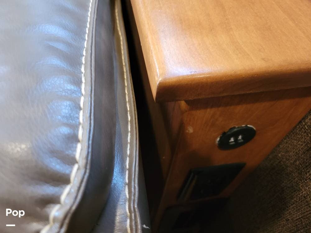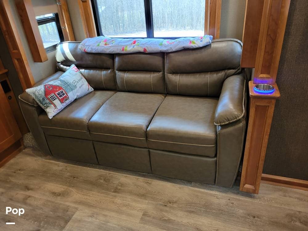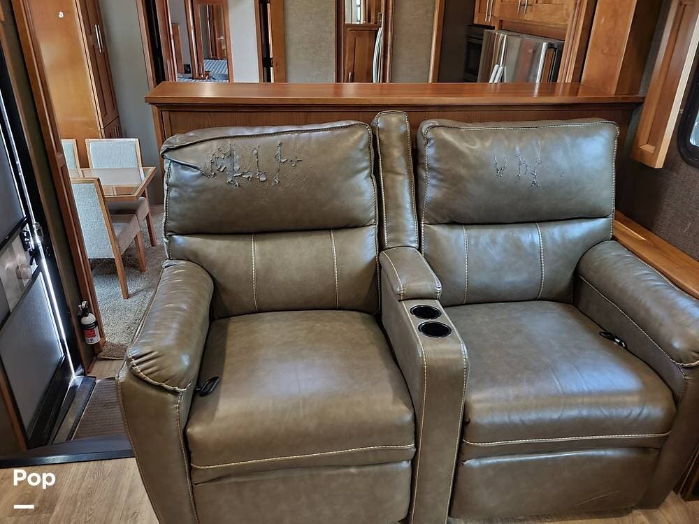 Step inside model 375FL and head up the steps to the front living area. There are dual opposing slides with 74" tri-fold sofas facing one another. There are also two 60" theater style recliners opposite a 55" TV and fireplace. There are USB Charging ports that can be accessed from the recliner or the sofa on the left side. There are two more USB ports accessible from the opposite sofa. This is the perfect spot to gather with family and friends.