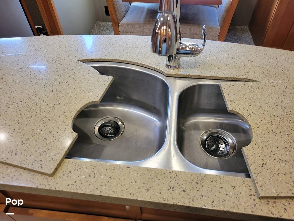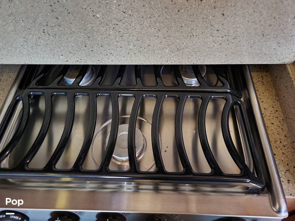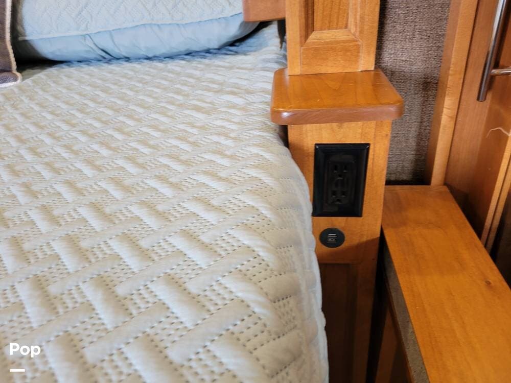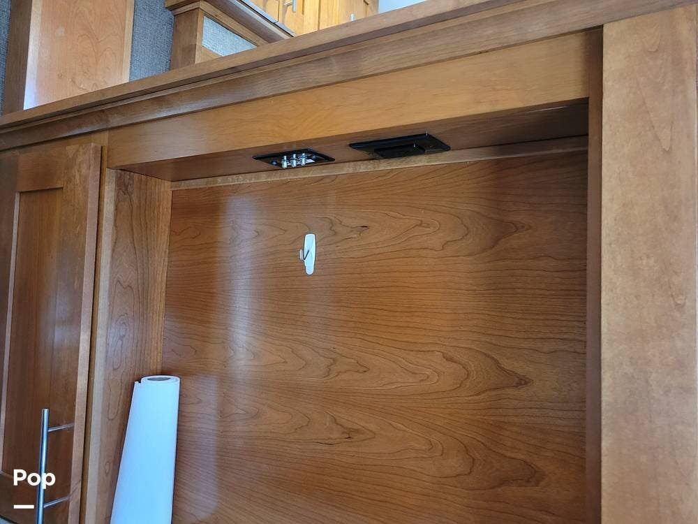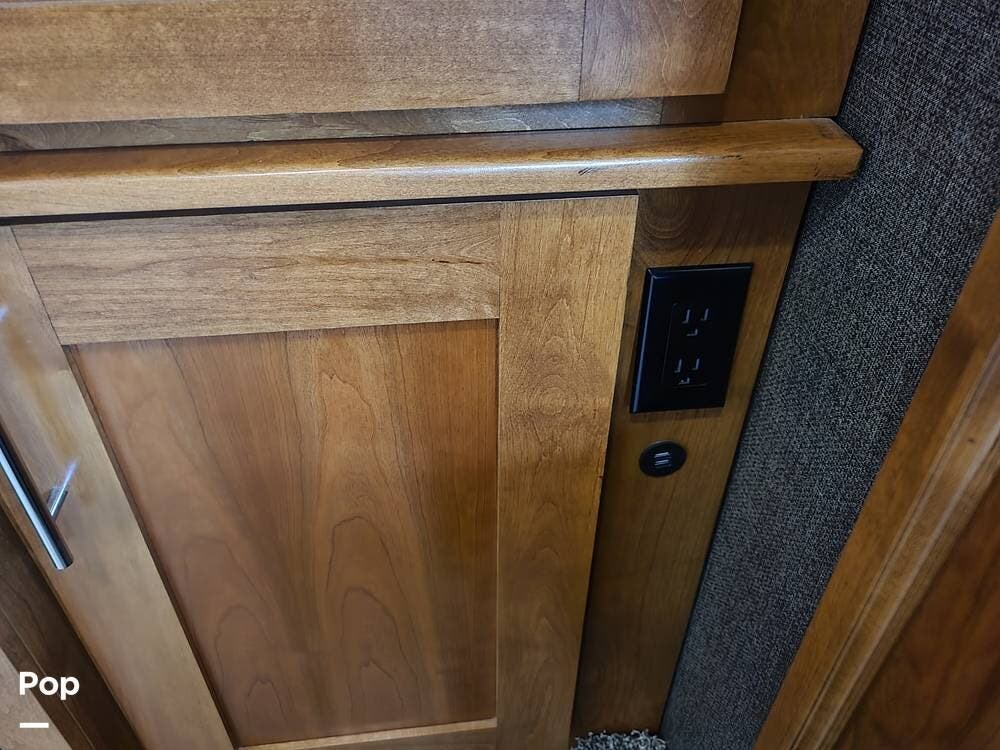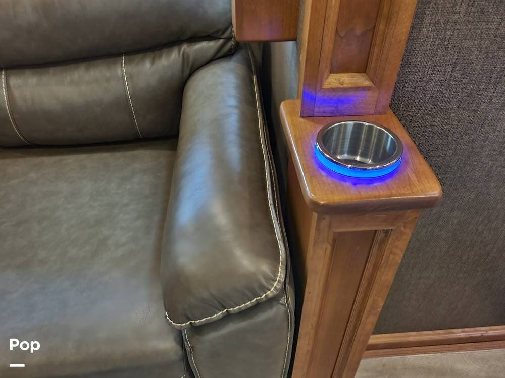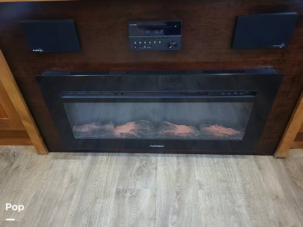 Step inside model 375FL and head up the steps to the front living area. There are dual opposing slides with 74" tri-fold sofas facing one another. There are also two 60" theater style recliners opposite a 55" TV and fireplace. There are USB Charging ports that can be accessed from the recliner or the sofa on the left side. There are two more USB ports accessible from the opposite sofa. This is the perfect spot to gather with family and friends.