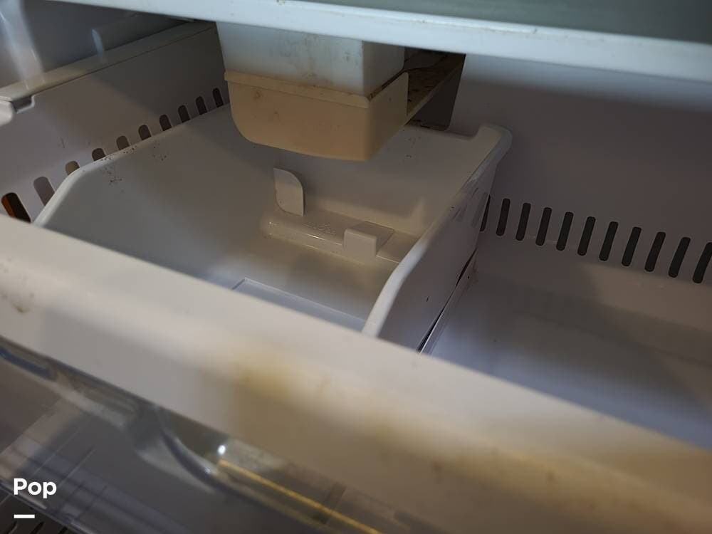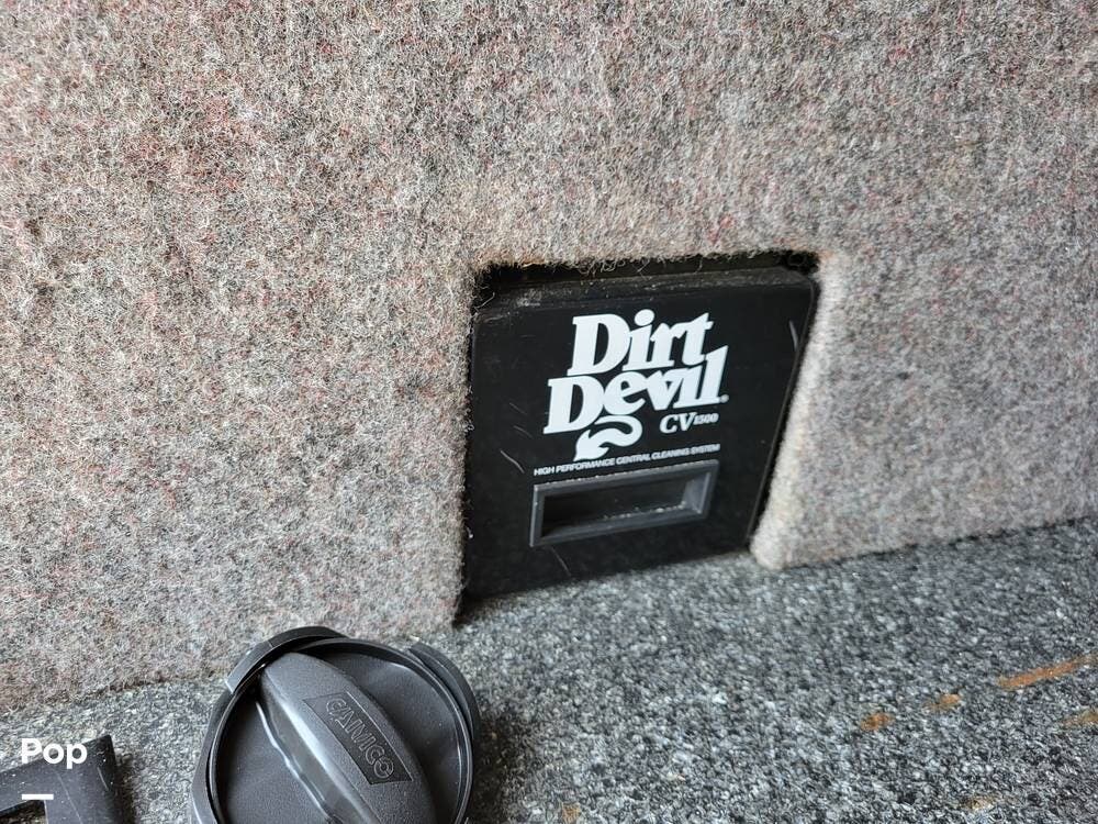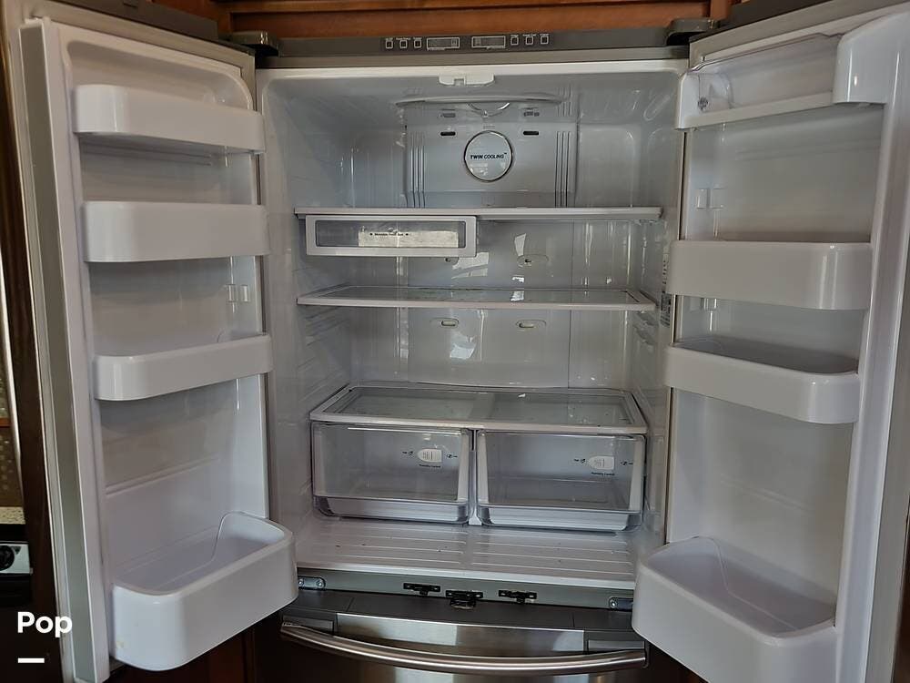 Going back down the steps the electronic control panel is mounted on your right. At the bottom step is access to the central vacuum system. Your next step takes you into the kitchen where on your right are cabinets and a place to mount a television. Next is your 18 Cu Ft Samsung refrigerator/freezer with icemaker. There is a three burner stove, conventional oven, a microwave convection oven, and a tile backsplash for easy clean up. The island offers more food prep space, and a double sink. Across from the kitchen is a dining table with four chairs, and next to it is a large pantry.