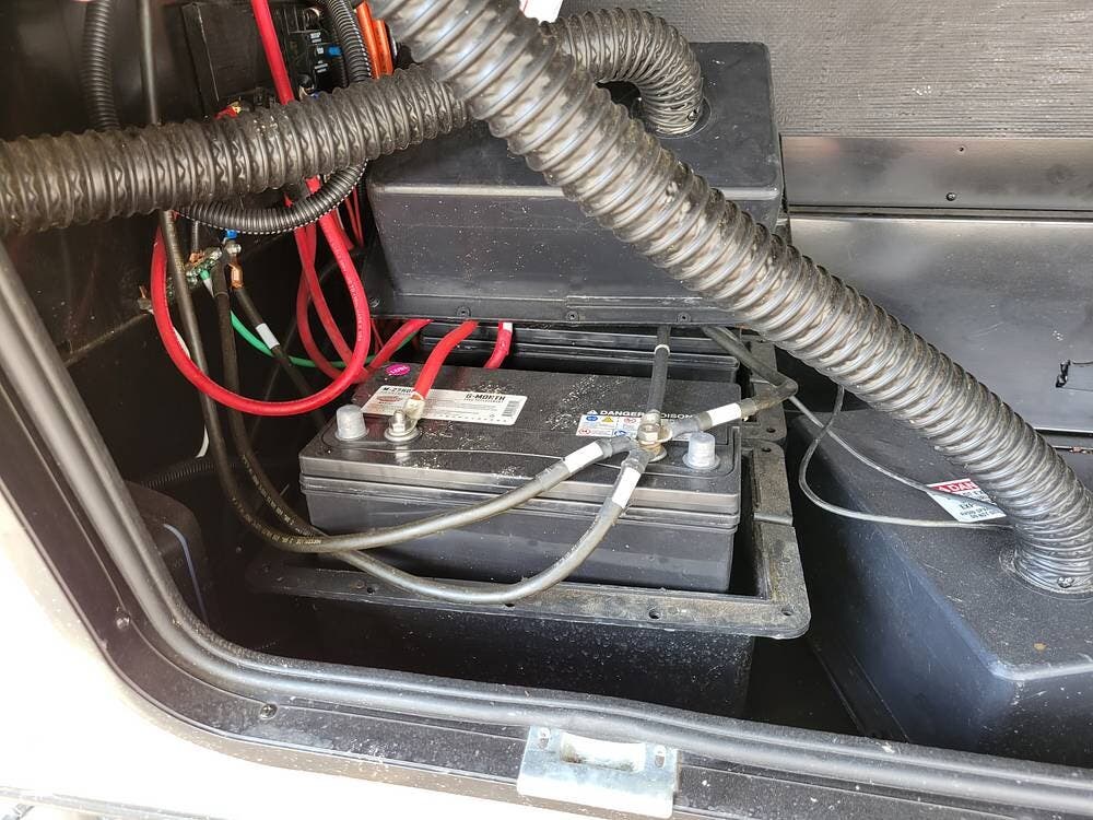 You can carry cargo up to 1.500 lbs most of which will go in the large pass through compartment. Set up will be easy with the auto leveling jacks. This unit comes with two house batteries and a 1000W inverter.