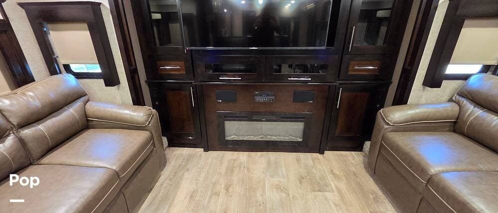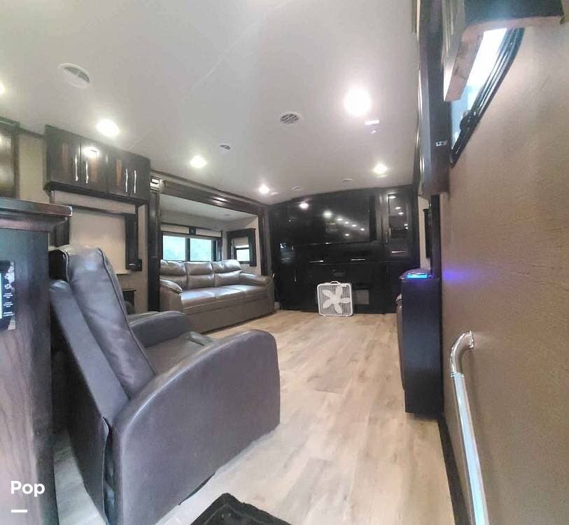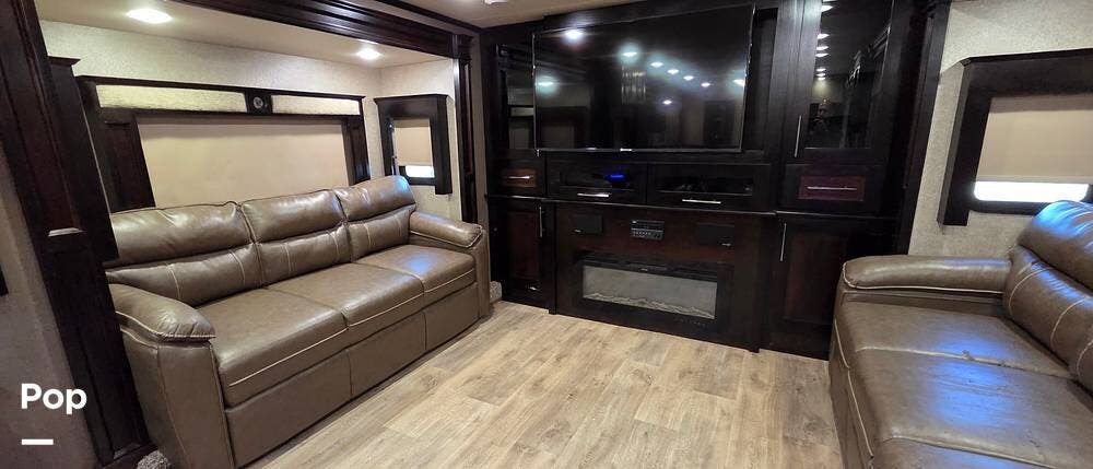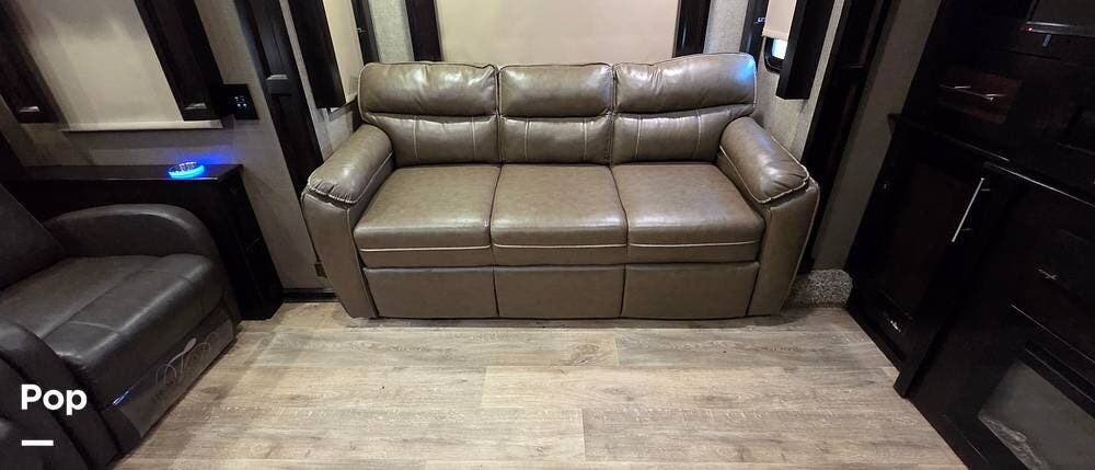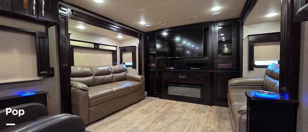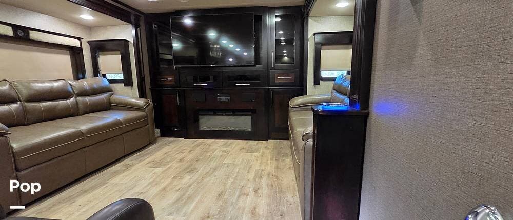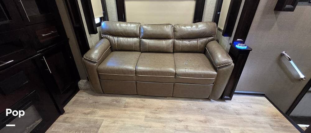 Step inside model 375FL and head up the steps to the front living area. There are dual opposing slides with 74" tri-fold sofas facing one another. There are also two 60" theater style recliners opposite a 55" TV and fireplace. There are USB Charging ports that can be accessed from the recliner or the sofa on the left side. There are two more USB ports accessible from the opposite sofa. This is the perfect spot to gather with family and friends.
