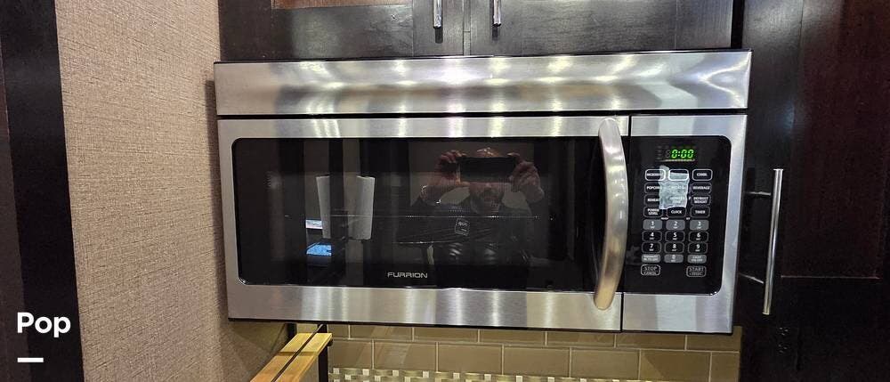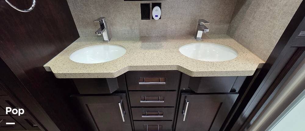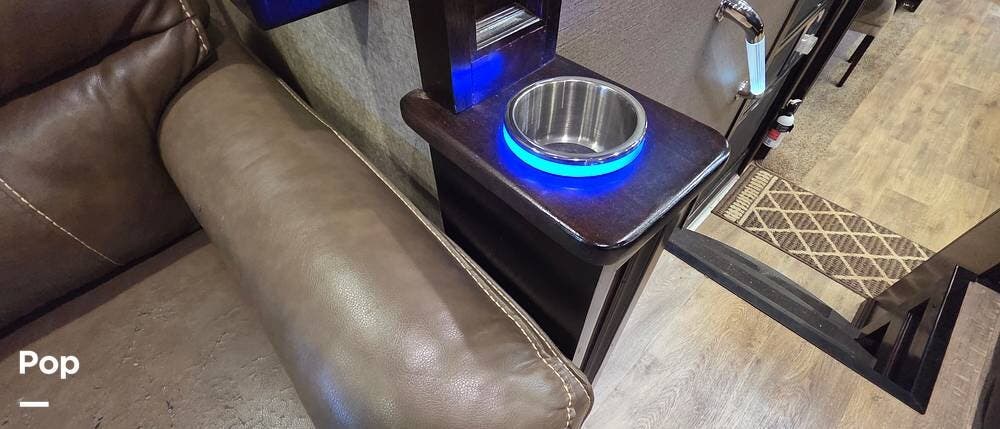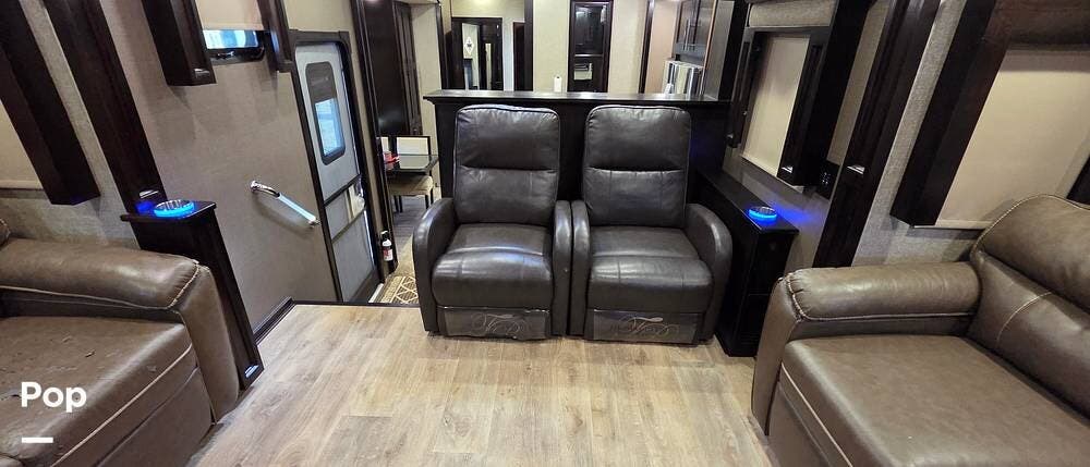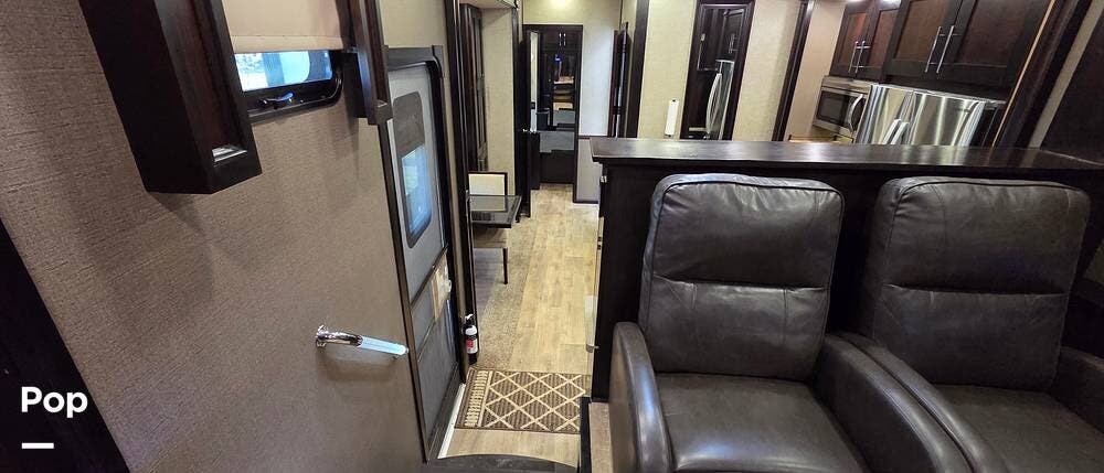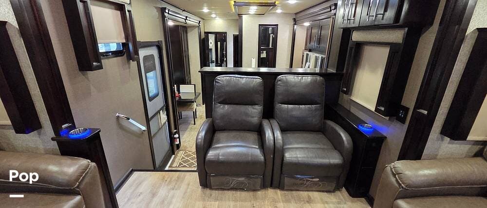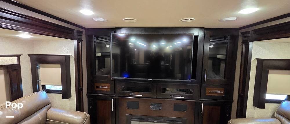 Step inside model 375FL and head up the steps to the front living area. There are dual opposing slides with 74" tri-fold sofas facing one another. There are also two 60" theater style recliners opposite a 55" TV and fireplace. There are USB Charging ports that can be accessed from the recliner or the sofa on the left side. There are two more USB ports accessible from the opposite sofa. This is the perfect spot to gather with family and friends.