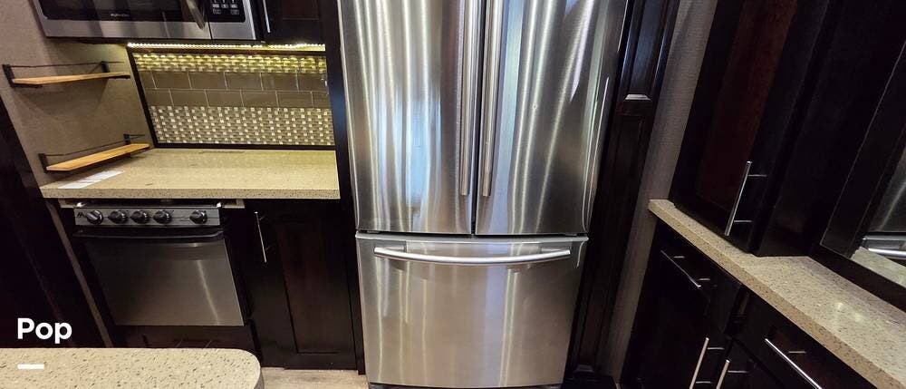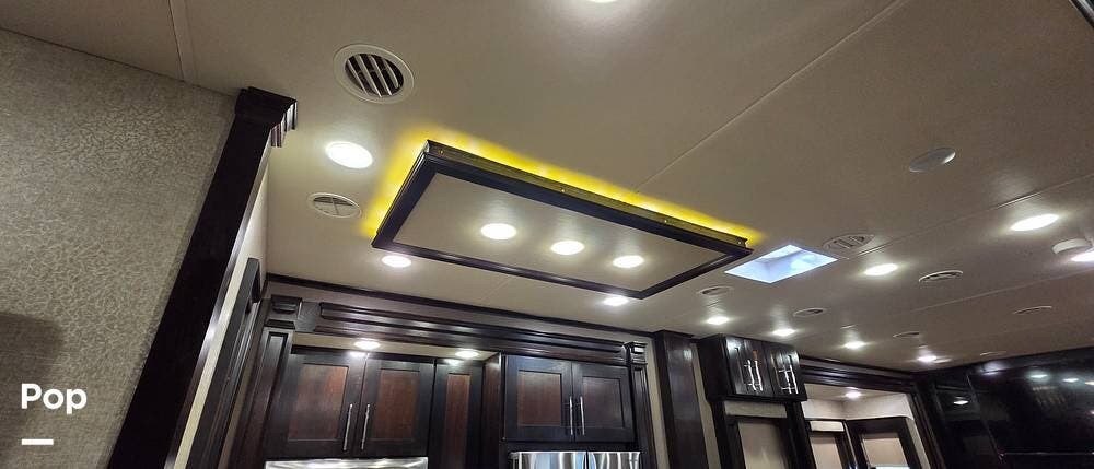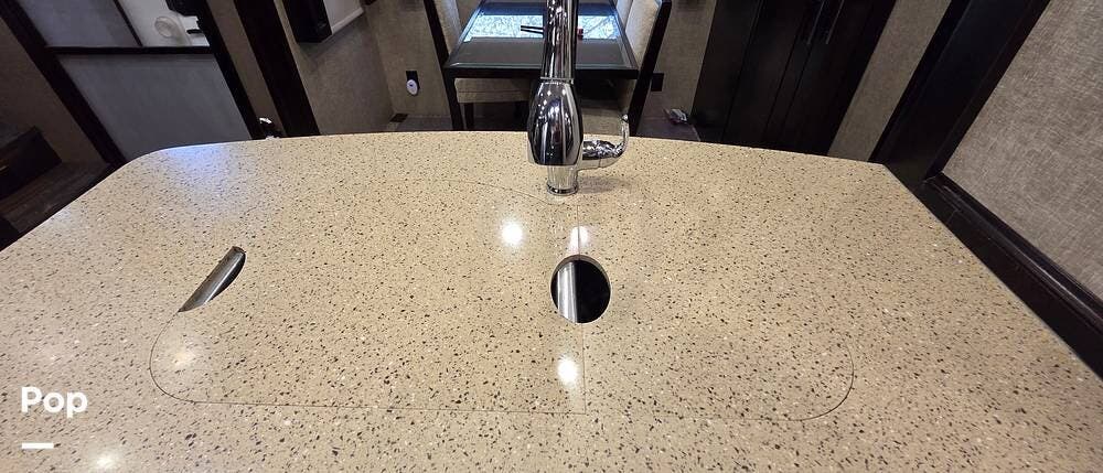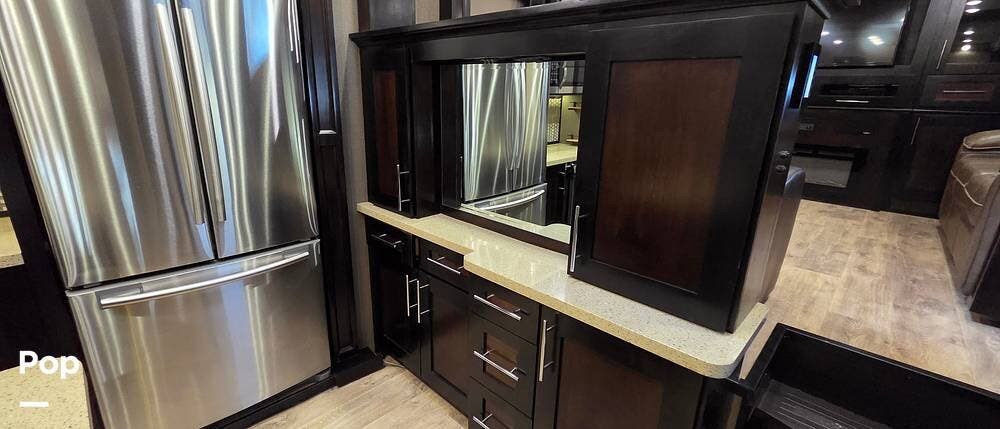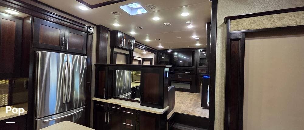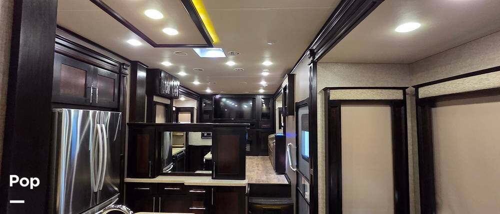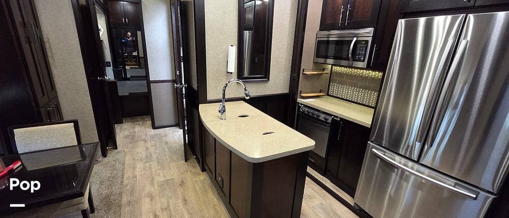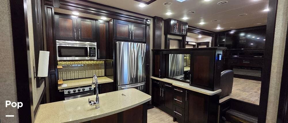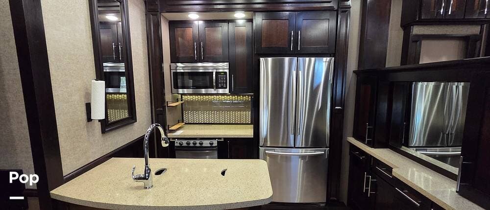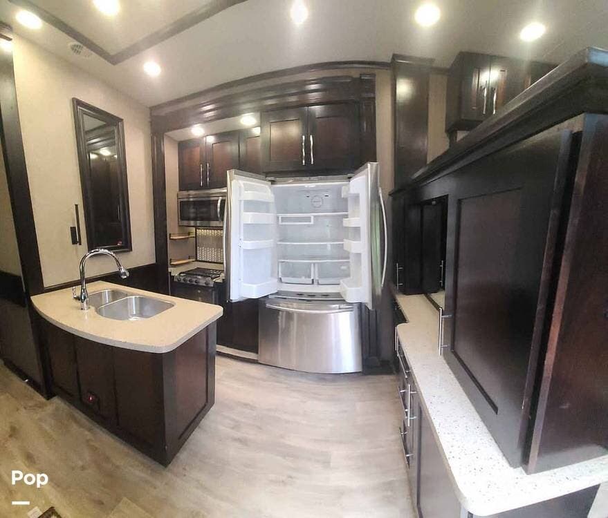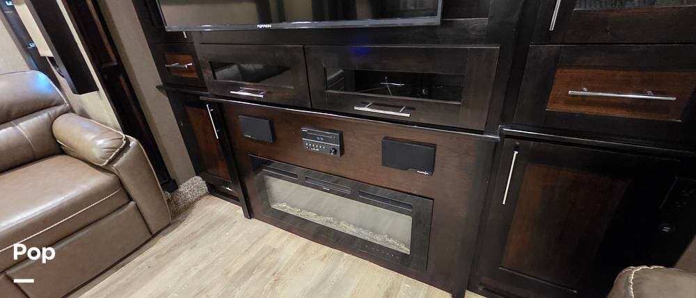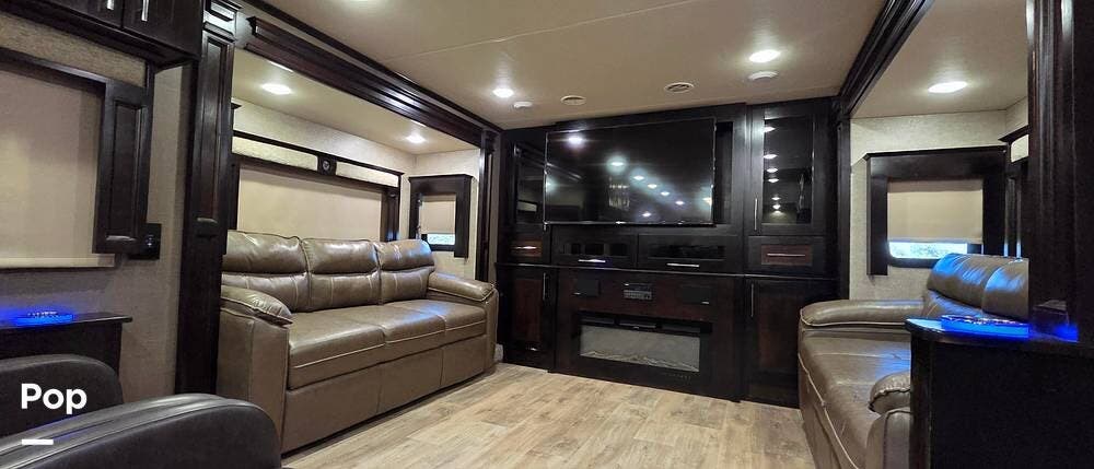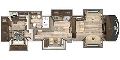Six slides set the tone for this Vanleigh Vilano luxury fifth wheel! With this much space, you will forget that you are not at home! This front living model features a spacious kitchen with residential touches, a complete bath with dual vanity sinks, and a convenient kitchen island, plus a fireplace, and more!