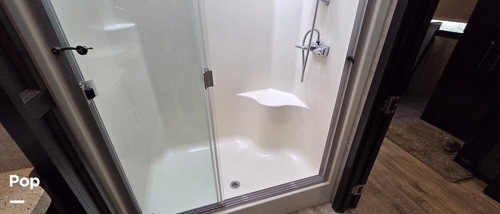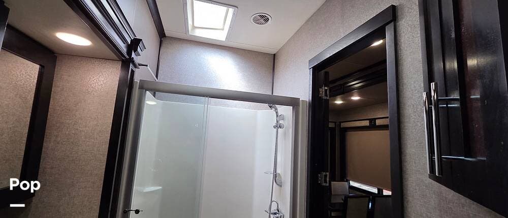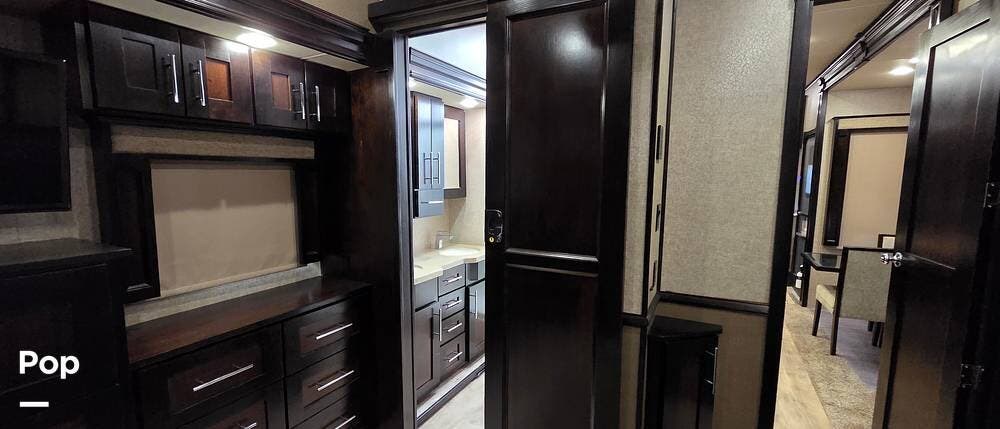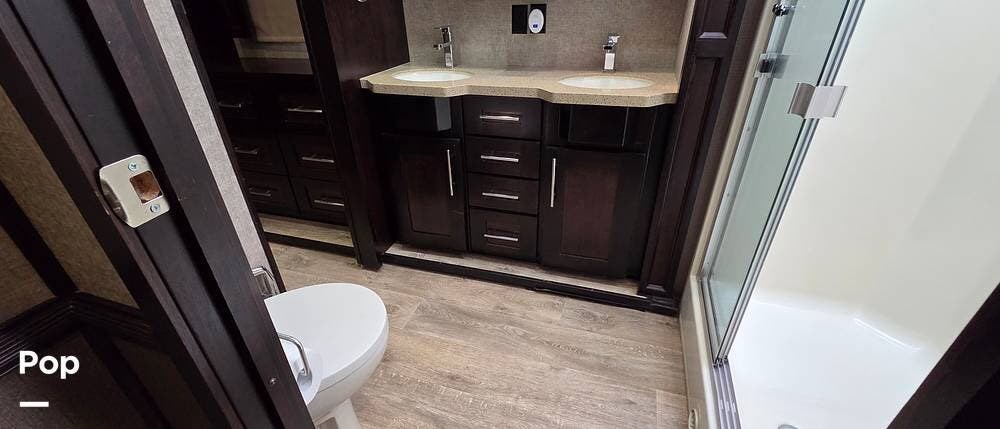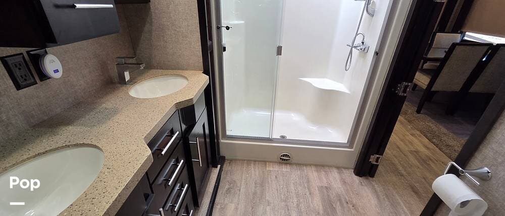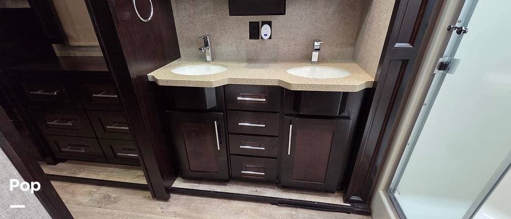 The rear of this Vilano fifth wheel features a private master bedroom and complete bath with dual entry doors. The door off the bedroom leads into the bath, which features a 48" x 30" shower, a toilet, and a slide-out vanity with dual sinks and overhead storage. This slide-out continues into the master bedroom, where there is also a second bath entry door giving immediate access as well. In the bedroom, you find lots of storage, a king-size bed, and USB ports next to the bed. There is a closet that is prepped for a washer and dryer, should you want one.