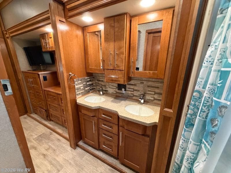 The rear of this Vilano fifth wheel features a private master bedroom and compete bath with dual entry doors. The door off the bedroom leads into the bath which features a 48" x 30" shower, a toilet, and a slide out vanity with dual sinks and overhead storage. This slide out continues into the master bedroom where there is also a second bath entry door giving immediate access as well.