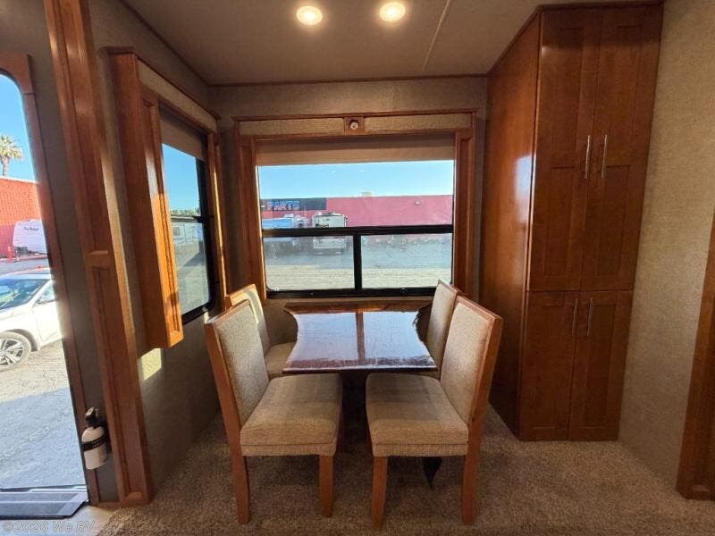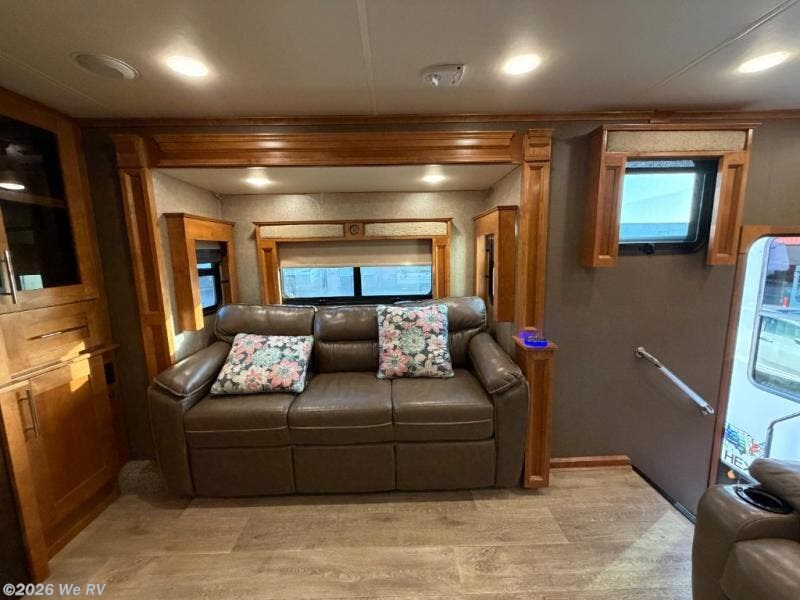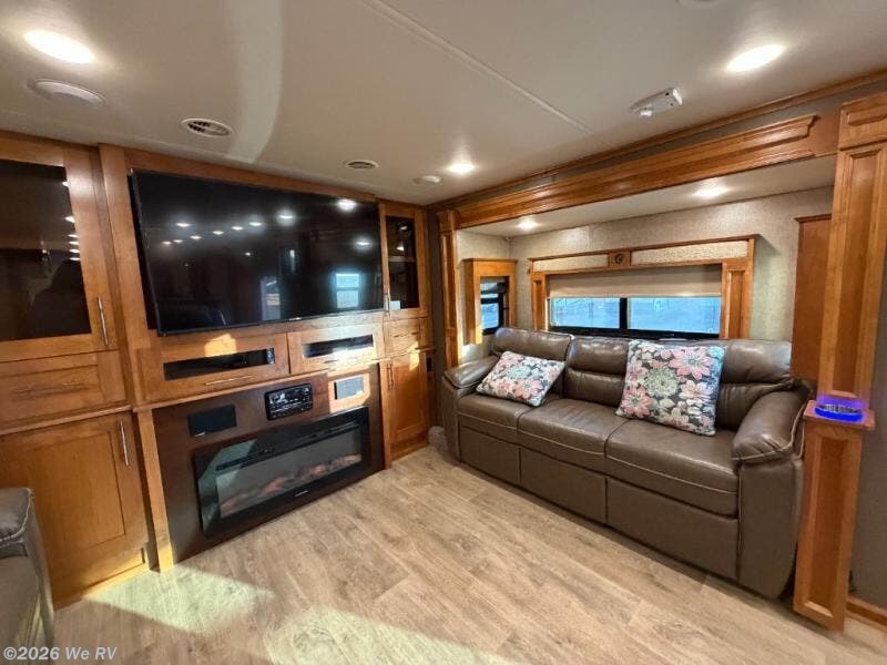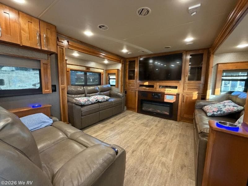 Six slides set the tone for this Vanleigh Vilano luxury fifth wheel! With this much space you will forget that you are not at home! This front living model features a spacious kitchen with residential touches, a complete bath with dual vanity sinks, and a convenient kitchen island, plus fireplace, and more!