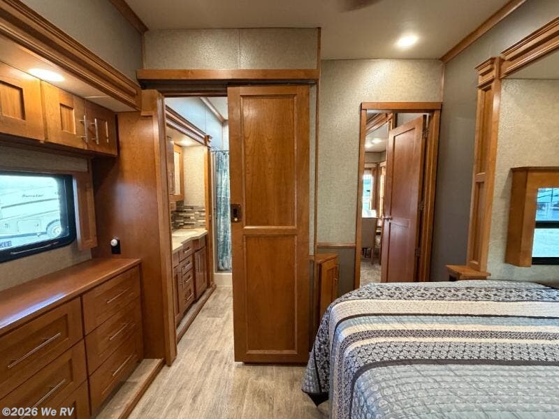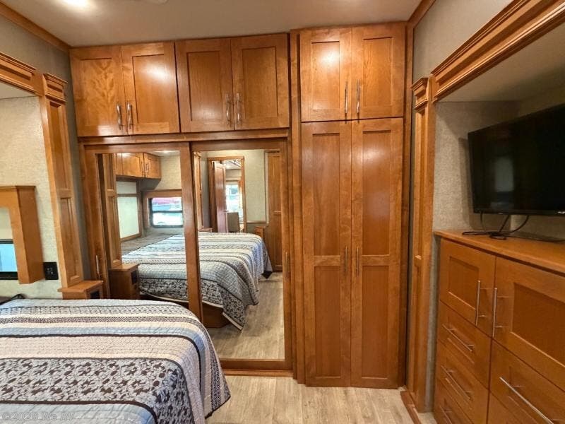 The bedroom space can also be accessed from the hallway door. Here you will find a comfortable queen or king bed slide out including nightstands. There is a chest of drawers within the slide opposite, and a rear wall wardrobe, plus an additional wardrobe that has been prepped for a washer and dryer if you choose to add the units, and so much more!