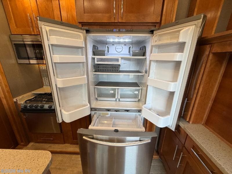 The entry door leads you into a very spacious kitchen also including dual opposing slides. The slide to your immediate left features a dining table for four, along with a pantry for all of your dry and canned food storage needs. A storage hutch with cabinets both above and below is located along the interior front. A center island offers food prep and cleanup space with a double sink facing the table. There is also a lighted overhead above the island. Along the road side wall you will find a second slide featuring a residential double door refrigerator, and a three burner range with overhead microwave oven. You will easily be able to whip up light meals and snacks while you are away from home.