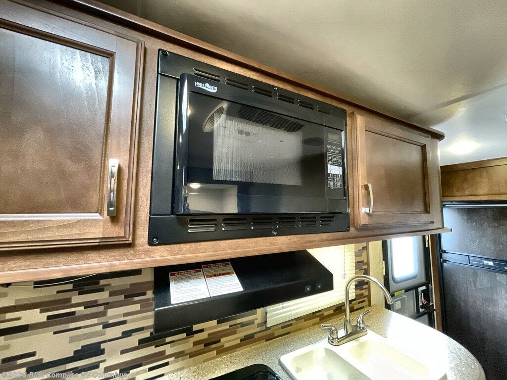 As you enter this model, to your left there is a refrigerator. To the right you will find a double kitchen sink, two burner range, and overhead cabinets. On the opposite side of the trailer there is a jiffy sofa slide and freestanding table. Next to the slide you can enjoy the entertainment center/pantry.