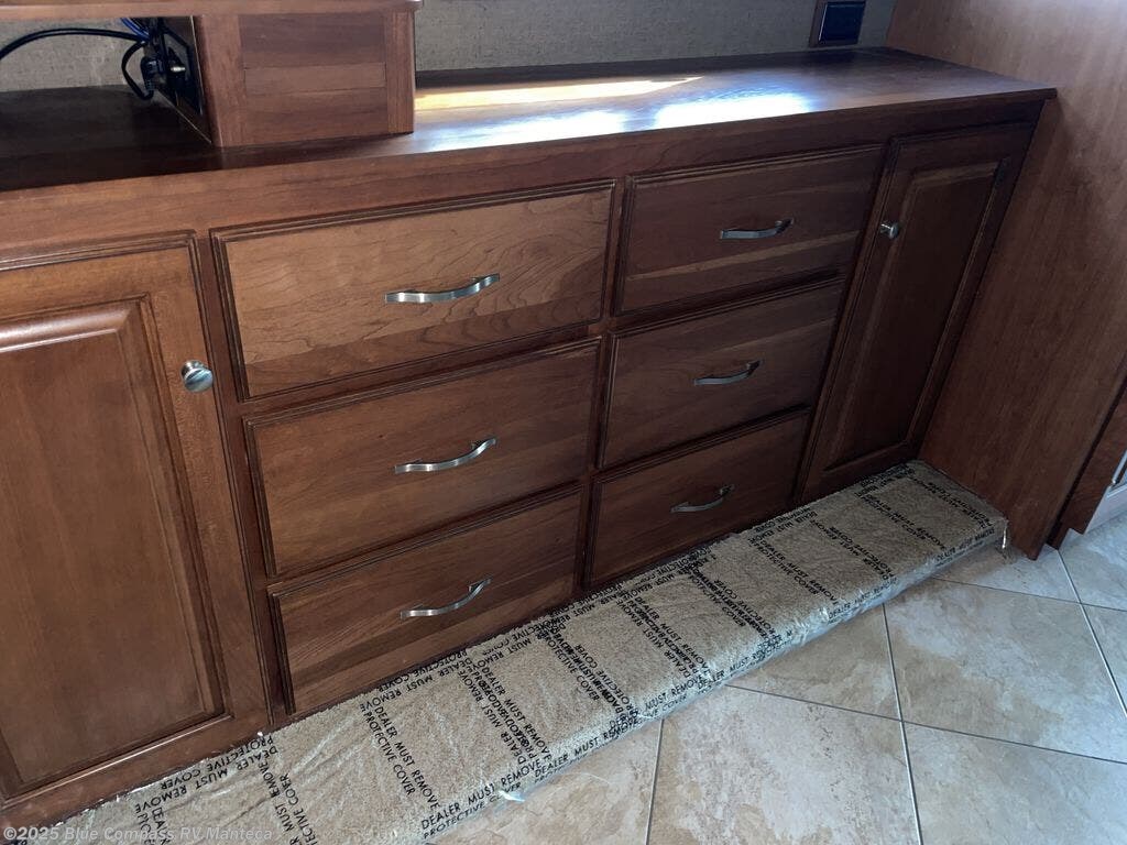 The full wall slide out starting behind the driver's seat features a Rest Easy sofa, an angled double kitchen sink and countertop, three burner range, and a 4-door refrigerator. There is also a storage cabinet that has been prepped for an optional washer and dryer, plus the slide continues to the rear ending with a chest of drawers and TV location for a 32" bedroom HDTV.