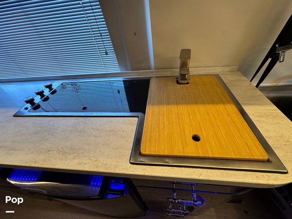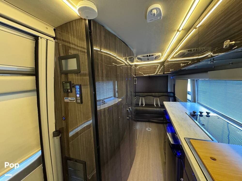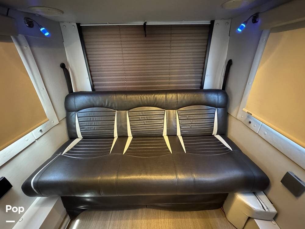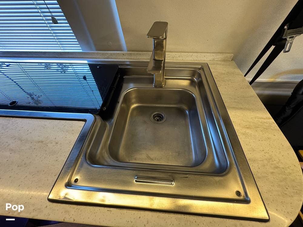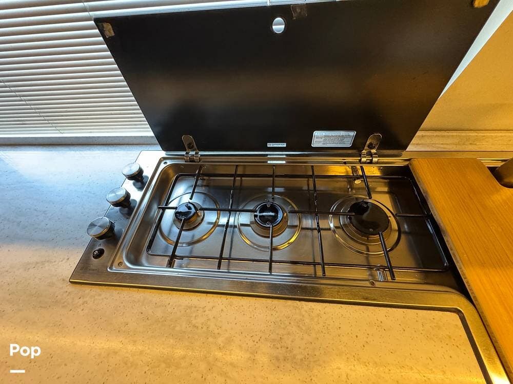 Inside, you'll find a well-designed layout featuring a single sink, a three-burner range, and an electric sofa bed that sleeps two.